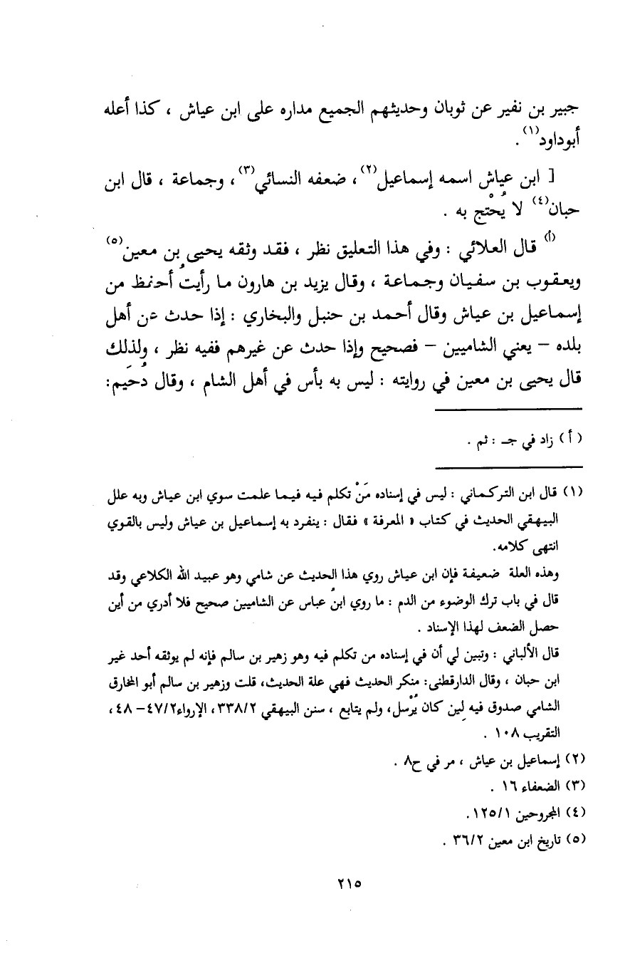 (أ) قال العلائي: وفي هذا التعليق نظر، فقد وثقه يحيى بن معين (¬5) ويعقوب بن سفيان وجماعة، وقال يزيد بن هارون ما رأيتُ أحفظ من إسماعيل بن عياش وقال أحمد بن حنبل والبخاري: إذا حدث عن أهل بلده -يعني الشاميين- فصحيح وإذا حدث عن غيرهم فقيه نظر، ولذلك قال يحيى بن معين في روايته: ليس به بأس في أهل الشام، وقال دُحَيم: