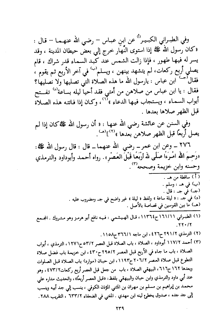 (¬3) أحمد 2/ 117 أبو داود، الصلاة، باب الصلاة قبل العصر 2/ 53 ح 1271، الترمذي، أبواب الصلاة، باب ما جاء في الأربع قبل العصر 2/ 295 ح 430، ابن خزيمة باب فضل صلاة التطوع قبل صلاة العصر 2/ 206 ح 1193، ابن حبان (موارد) باب الصلاة قبل الصلوات وبعدها 162 ح 616، البيهقي الصلاة، باب من جعل قبل العصر أربع ركعات 2/ 473، وهو عند أبي داود والترمذي وابن حبان والبيهقي بلفظ: "قبل العصر أربعًا"، والحديث مداره علي محمد بن إبراهيم بن مسلم بن مهران بن المثنى المؤذن الكوفي، ينسب إلى جد أبيه وينسب إلى جد جده، صدوق يخطئ لينه ابن مهدي. المغني في الضعفاء 2/ 633، التقريب 288.