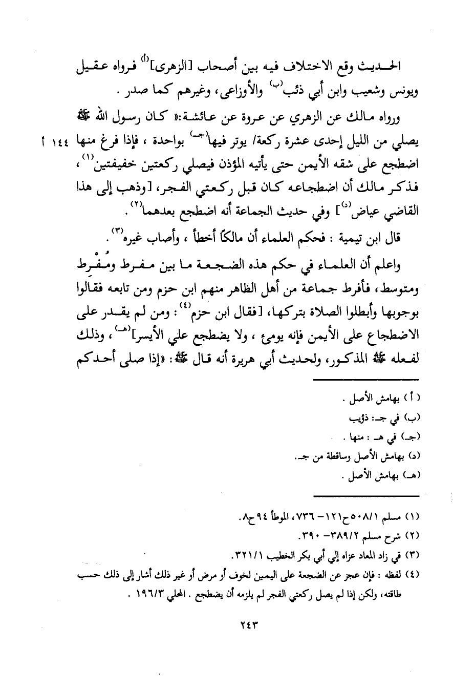 ورواه مالك عن الزهري عن عروة عن عائشة: "كان رسول اللَّه - صلى الله عليه وسلم - يصلي من الليل إحدى عشرة ركعة يوتر فيها (جـ) بواحدة، فإذا فرغ منها اضطجع على شقه الأيمن حتى يأتيه المؤذن فيصلي ركعتين خفيفتين (¬1)، فذكر مالك أن اضطجاعه كان قبل ركعتي الفجر، [وذهب إلى هذا القاضي عياض (د)] وفي حديث الجماعة أنه اضطجع بعدهما (¬2).