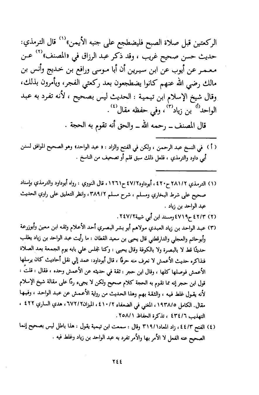 الركعتين قبل صلاة الصبح فليضطجع على جنبه الأيمن" (¬1) قال الترمذي: حديت حسن صحيح غريب، وقد ذكر عبد الرزاق في "المصنف" (¬2) عن معمر عن أيوب عن ابن سيرين أن أبا موسى ورافع بن خديج وأنس بن مالك رضي اللَّه عنهم كانوا يضطجعون بعد ركعتي الفجر، ويأمرون بذلك، وقال شيخ الإسلام ابن تيمية: الحديث ليس بصحيح، لأنه تفرد به عبد الواحد (أ) بن زياد (¬3)، وفي حفظه مقال (¬4).