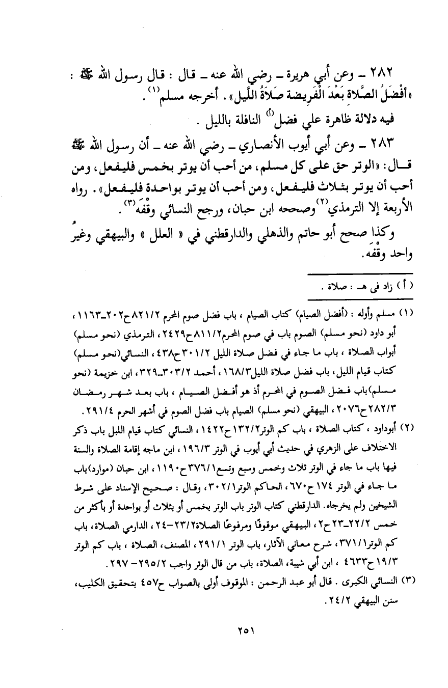 282 - وعن أبي هريرة -رضي اللَّه عنه- قال: قال رسول اللَّه - صلى الله عليه وسلم -: "أفْضَلُ الصَّلاةِ بَعْدَ الْفَرِيضة صَلَاةُ اللَّيل". أخرجه مسلم (¬1).