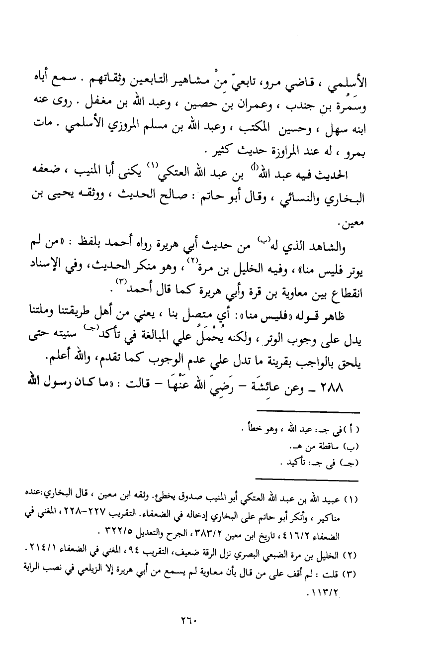 (¬1) عبيد اللَّه بن عبد اللَّه العتكي أبو المنيب صدوق يخطئ. وثقه ابن معين، قال البخاري: عنده مناكير، وأنكر أبو حاتم على البخاري إدخاله في الضعفاء. التقريب 227 - 228، المغني في الضعفاء 2/ 416، تاريخ ابن معين 2/ 383، الجرح والتعديل 5/ 322.
