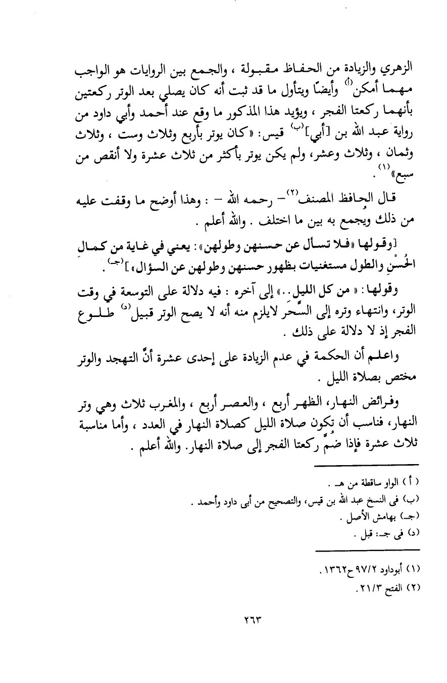 الزهري والزيادة من الحفاظ مقبولة، والجمع بين الروايات هو الواجب مهما أمكن (أ) وأيضًا ويتأول ما قد ثبت أنه كان يصلي بعد الوتر ركعتين بأنهما ركعتا الفجر، ويؤيد هذا المذكور ما وقع عند أحمد وأبي داود من رواية عبد اللَّه بن [أبي] (ب) قيس: "كان يوتر بأربع وثلاث وست، وثلاث وثمان، وثلاث وعشر، ولم يكن يوتر بأكثر من ثلاث عشرة ولا أنقص من سبع" (¬1).