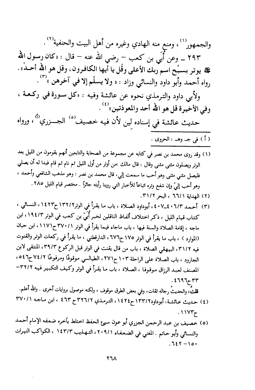 (¬3) أحمد 3/ 406 - 407، أبو داود الصلاة، باب ما يقرأ في الوتر 2/ 132 ح 1423، النسائي، كتاب قيام الليل، ذكر اختلاف ألفاظ الناقلين لخبر أُبَي بن كعب في الوتر 3/ 194، ابن ماجه، إقامة الصلاة والسنة فيها، باب ما جاء فيما يقرأ في الوتر 1/ 370 ح 1171، ابن حبان (الموارد)، باب ما يقرأ في الوتر 175 ح 676، الدارقطني، ما يقرأ في ركعات الوتر والقنوت فيه 2/ 31، البيهقي الصلاة، باب من قال يقنت في الوتر قبل الركوع 3/ 39، المنتقى لابن الجارود، باب الصلاة على الراحلة 103 ح 271، الطيالسي موقوفًا ومرفوعًا 2/ 74 ح 546، المصنف لعبد الرزاق موقوفًا، الصلاة، باب ما يقرأ في الوتر وكيف التكبير فيه 2/ 32 - 33 ح 4696.