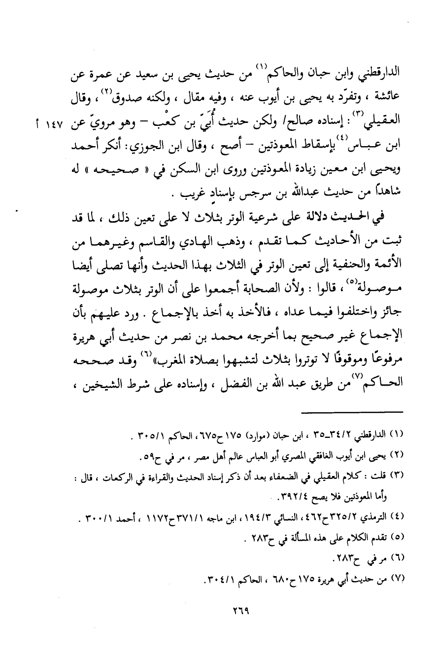 (¬3) قلت: كلام العقيلي في الضعفاء بعد أن ذكر إسناد الحديث والقراءة في الركعات، قال: وأما المعوذتين فلا يصح 4/ 392.