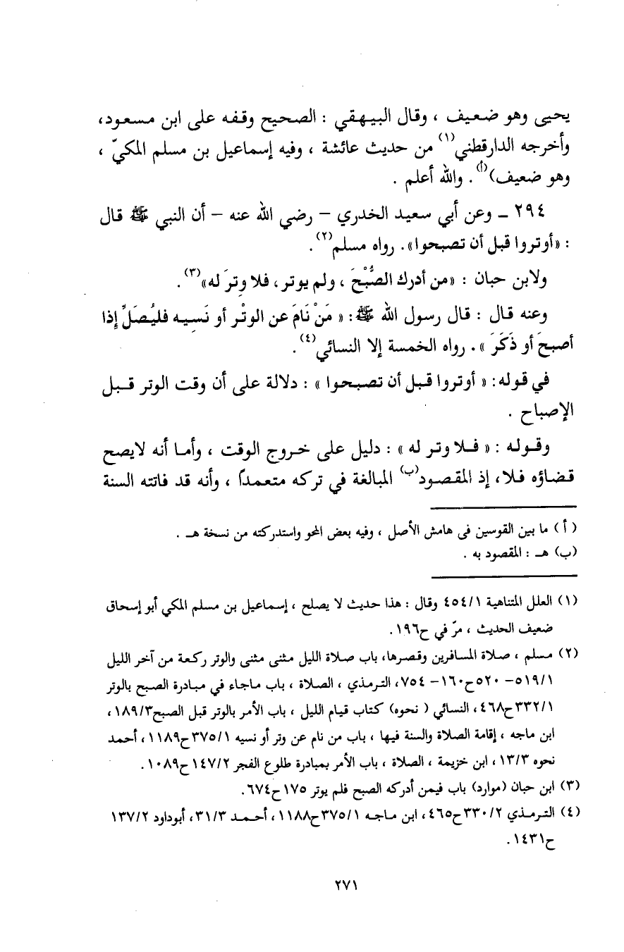(¬2) مسلم، صلاة المسافرين وقصرها، باب صلاة الليل مثنى مثنى والوتر ركعة من آخر الليل 1/ 519 - 520 ح 160 - 754، الترمذي، الصلاة، باب ما جاء في مبادرة الصبح بالوتر 1/ 332 ح 468، النسائي (نحوه) كتاب قيام الليل، باب الأمر بالوتر قبل الصبح 3/ 189، ابن ماجه، إقامة الصلاة والسنة فيها، باب من نام عن وتر أو نسيه 1/ 375 ح 1189، أحمد نحوه 3/ 13، ابن خزيمة، الصلاة، باب الأمر بمبادرة طلوع الفجر 2/ 147 ح 1089.
