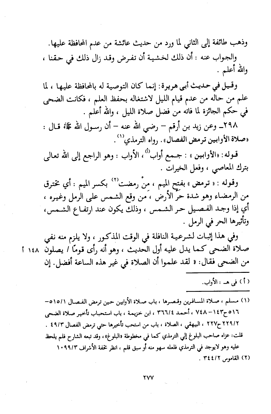 298 - وعن زيد بن أرقم -رضي اللَّه عنه- أن رسول اللَّه - صلى الله عليه وسلم - قال: "صلاة الأوابين ترمض الفصال". رواه الترمذي (¬1).