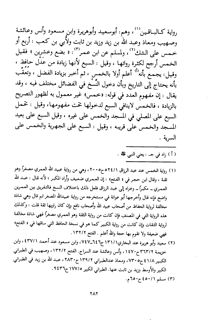 (¬2) سعيد وأبو هريرة عند البخاري 1/ 131 ح 646 - 747، وابن مسعود عند أحمد 1/ 437، وابن خزيمة 2/ 363 ح 1470، وأنس وعائشة عند السراج. الفتح 2/ 132، وصهيب في الطبراني الكبير 8/ 41 ح 7305، ومعاذ عند الطبراني 2/ 139 ح 2830، عبد اللَّه بن زيد في الطبراني الكبير والأوسط وزيد بن ثابت عنها. الطبراني الكبير 5/ 177 ح 9436.