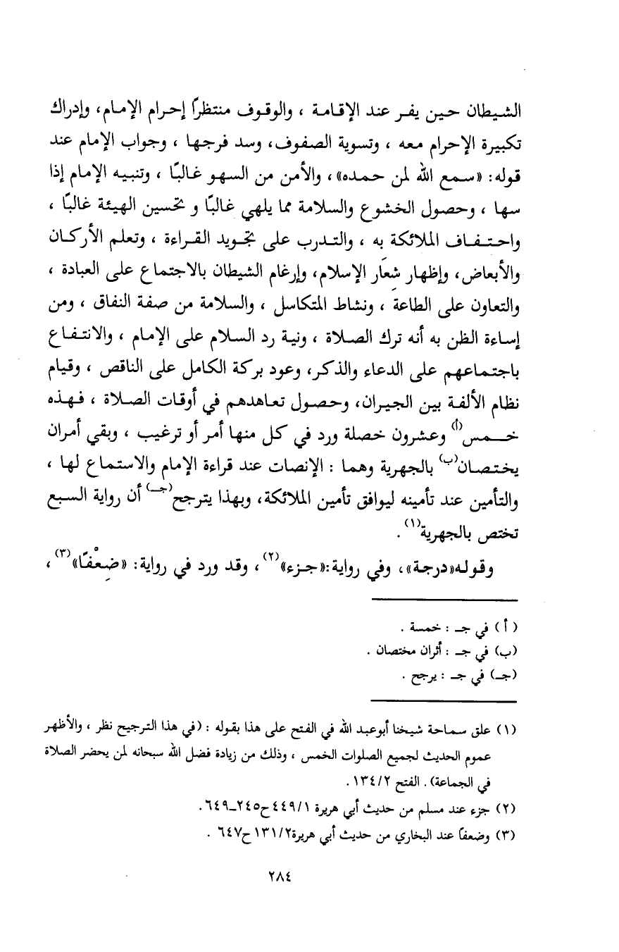 الشيطان حين يفر عند الإقامة، والوقوف منتظرًا إحرام الإمام، وإدراك تكبيرة الإحرام معه، وتسوية الصفوف، وسد فرجها، وجواب الإمام عند قوله: "سمع اللَّه لمن حمده"، والأمن من السهو غالبًا، وتنبيه الإمام إذا سها، وحصول الخشوع والسلامة مما يلهي غالبًا وتحسين الهيئة غالبًا، واحتفاف الملائكة به، والتدرب على تجويد القراءة، وتعلم الأركان والأبعاض، وإظهار شِعَار الإسلام، وإرغام الشيطان بالاجتماع على العبادة، والتعاون على الطاعة، ونشاط المتكاسل، والسلامة من صفة النفاق، ومن إساءة الظن به أنه ترك الصلاة، ونية رد السلام على الإمام، والانتفاع باجتماعهم على الدعاء والذكر، وعود بركة الكامل على الناقص، وقيام نظام الألفة بين الجيران، وحصول تعاهدهم في أوقات الصلاة، فهذه خمس (أ) وعشرون خصلة ورد في كل منها أمر أو ترغيب، وبقي أمران يختصان (ب) بالجهرية وهما: الإنصات عند قراءة الإمام والاستماع لها، والتأمين عند تأمينه ليوافق تأمين الملائكة، وبهذا يترجح (جـ) أن رواية السبع تختص بالجهرية (¬1).