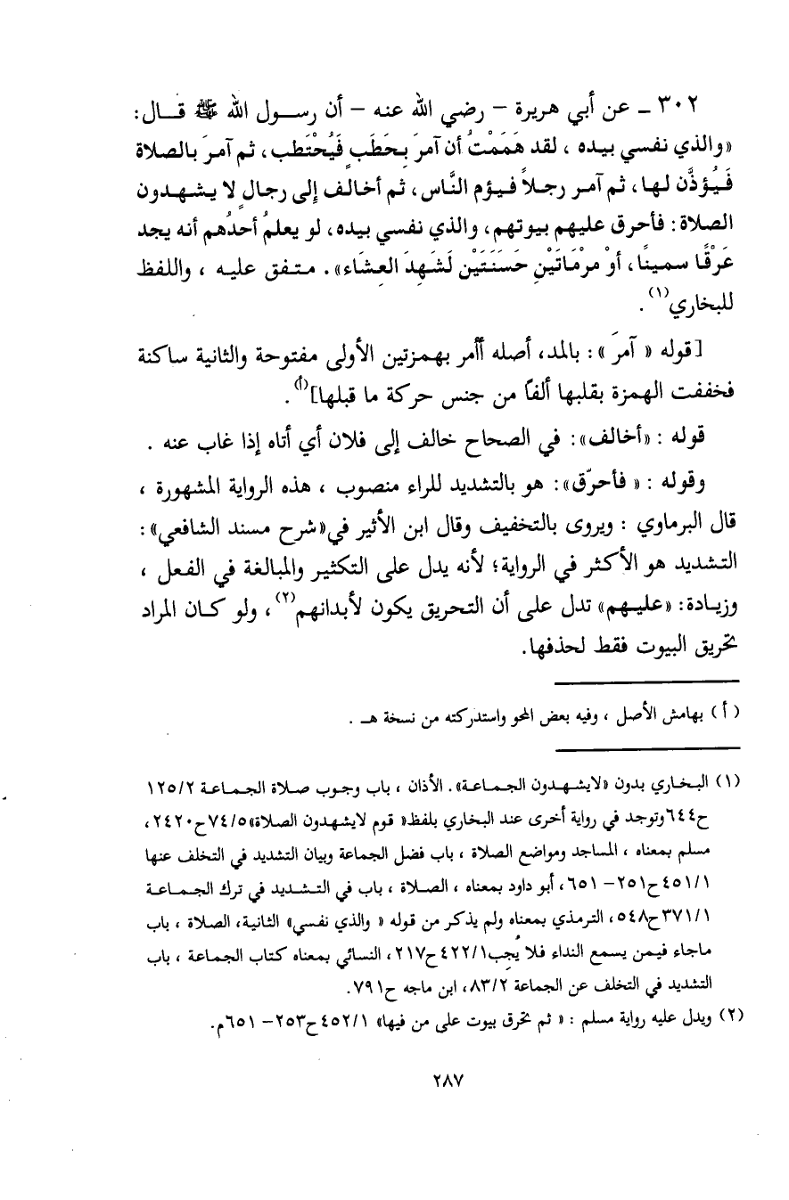 302 - عن أبي هريرة -رضي اللَّه عنه- أن رسول اللَّه - صلى الله عليه وسلم - قال: "والذي نفسي بيده، لقد هَمَمْت أن آمرَ بِحَطَبٍ فَيُحْتَطب، ثم آمرَ بالصلاة فَيُؤذَّن لها، ثم آمر رجلًا فيؤم النَّاس، ثم أخالف إِلى رجالٍ لا يشهدون الصلاة: فأحرق عليهم بيوتهم، والذي نفسي بيده، لو يعلم أحدُهم أنه يجد عَرْقًا سمينًا، أوْ مرْمَاتَيْنِ حَسَنَتَين لَشَهِدَ العِشَاء". متفق عليه، واللفظ للبخاري (¬1).