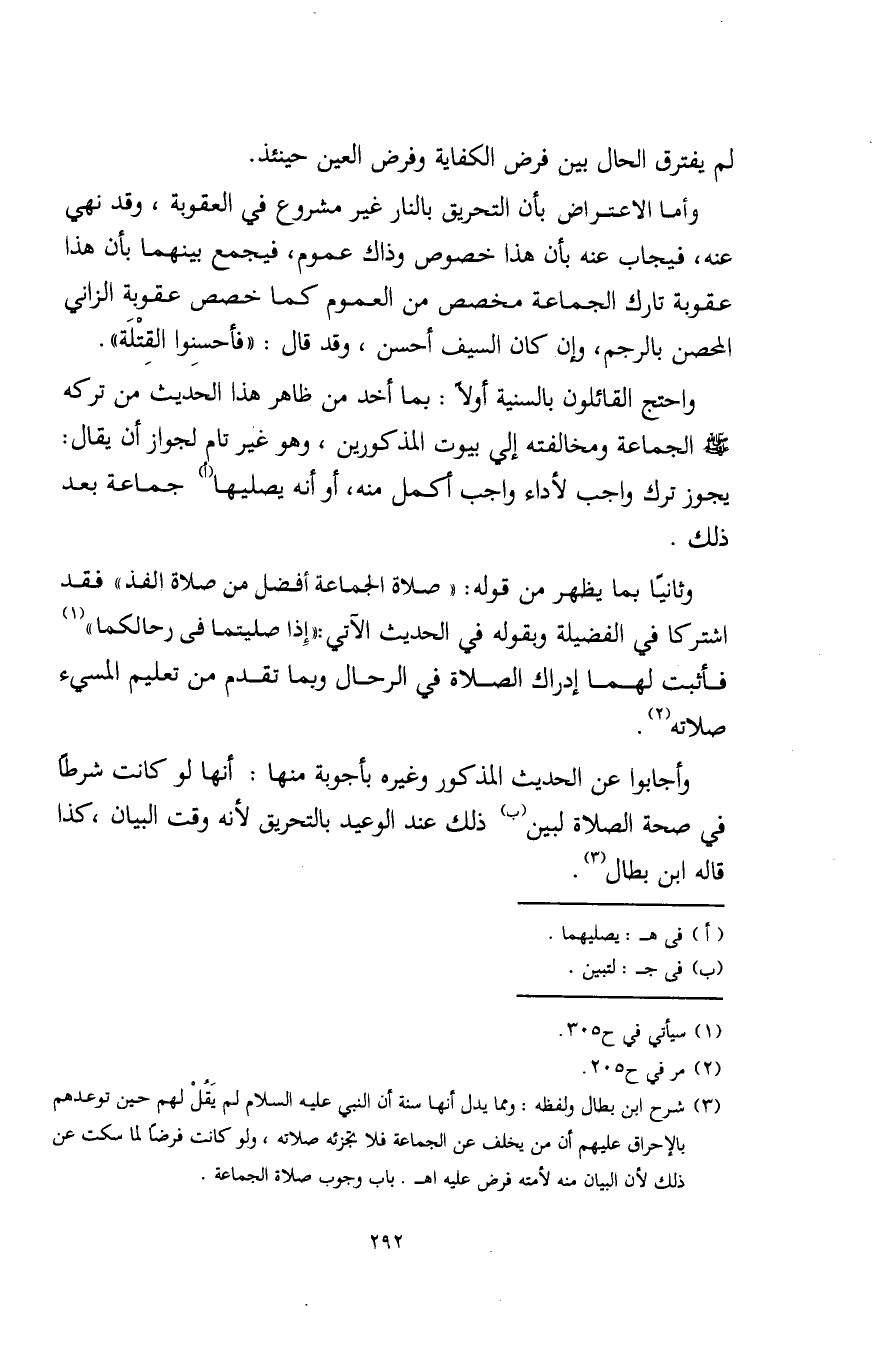 (¬3) شرح ابن بطال ولفظه: ومما يدل أنها سنة أن النبي - عليه السلام - لم يَقُلْ لهم حين توعدهم بالإحراق عليهم أن من يخلف عن الجماعة فلا تجزئه صلاته، ولو كانت فرضًا لما سكت عن ذلك لأن البيان فه لأمته فرض عليه اهـ. باب وجوب صلاة الجماعة.
