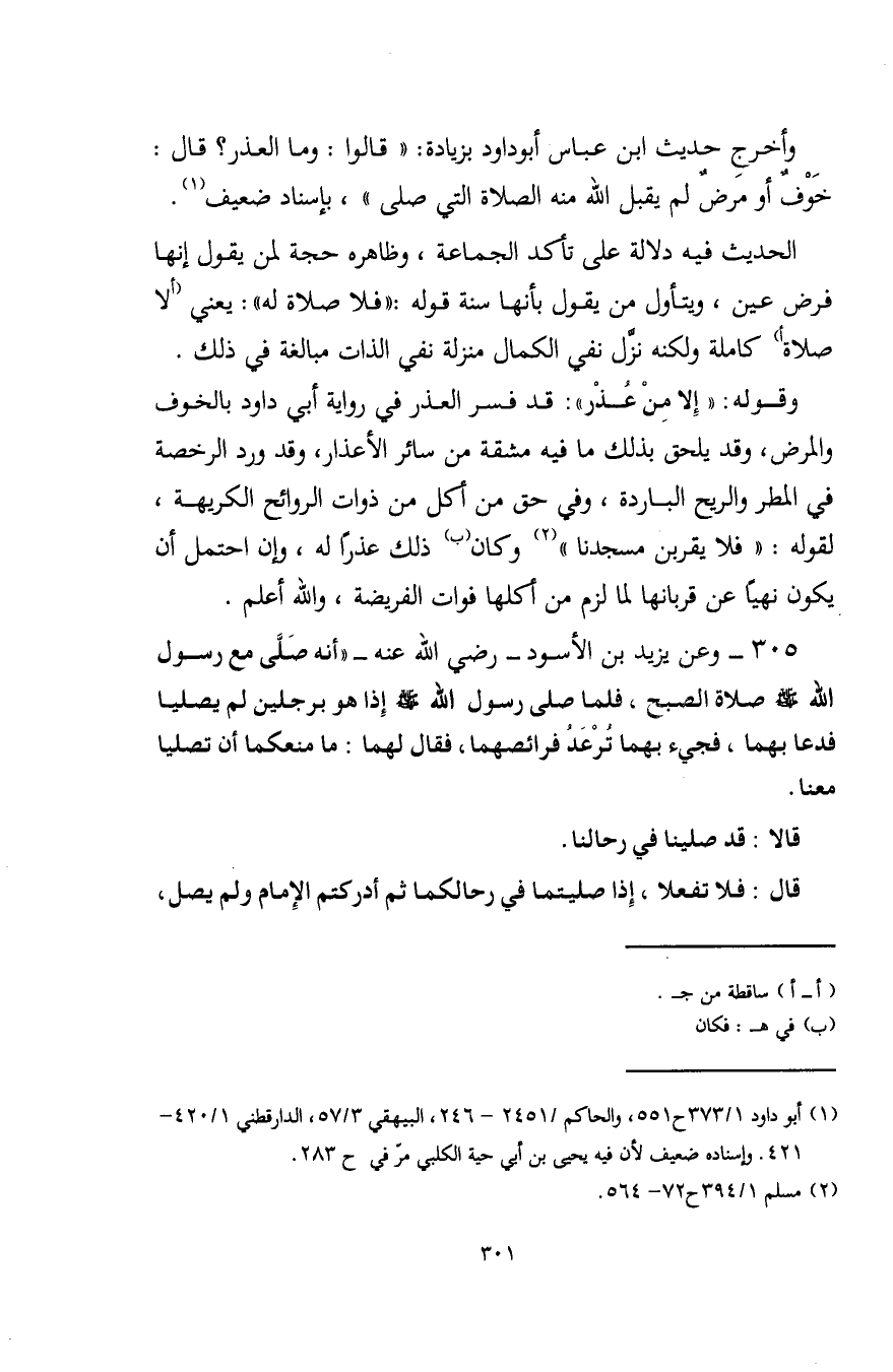 (¬1) أبو داود 1/ 373 ح 551، والحاكم / 2451 - 246، البيهقي 3/ 57، الدارقطني 1/ 420 - 421. وإسناده ضعيف لأن فيه يحيى بن أبي حية الكلبي مر في ح 283.