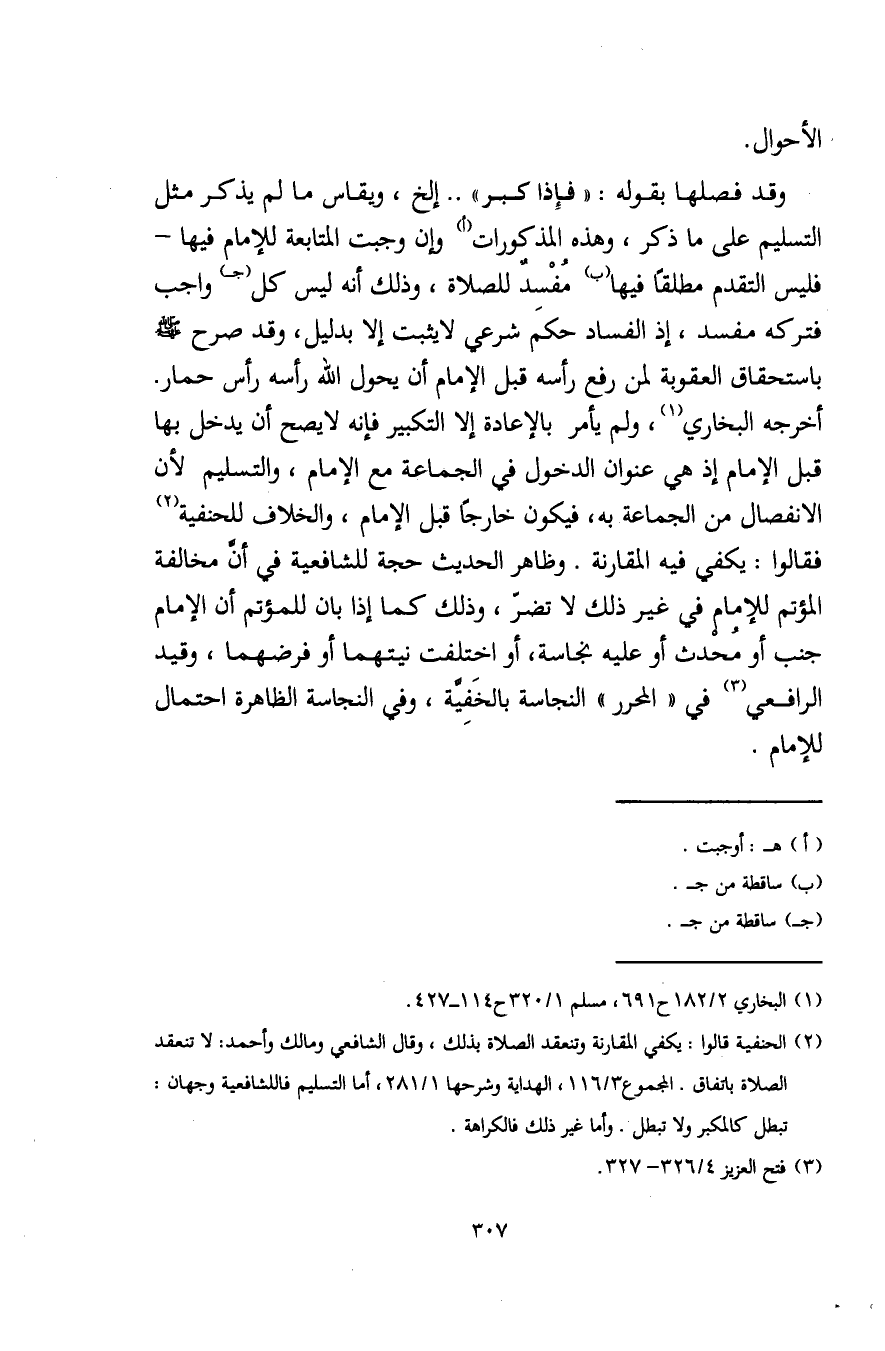 (¬2) الحنفية قالوا: يكفي المقارنة وتنعقد الصلاة بذلك، وقال الشافعي ومالك وأحمد: لا تنعقد الصلاة باتفاق. المجموع 3/ 116، الهداية وشرحها 1/ 281، أما التسليم فاللشافعية وجهان: تبطل كالمكبر ولا تبطل. وأما غير ذلك فالكراهة.
