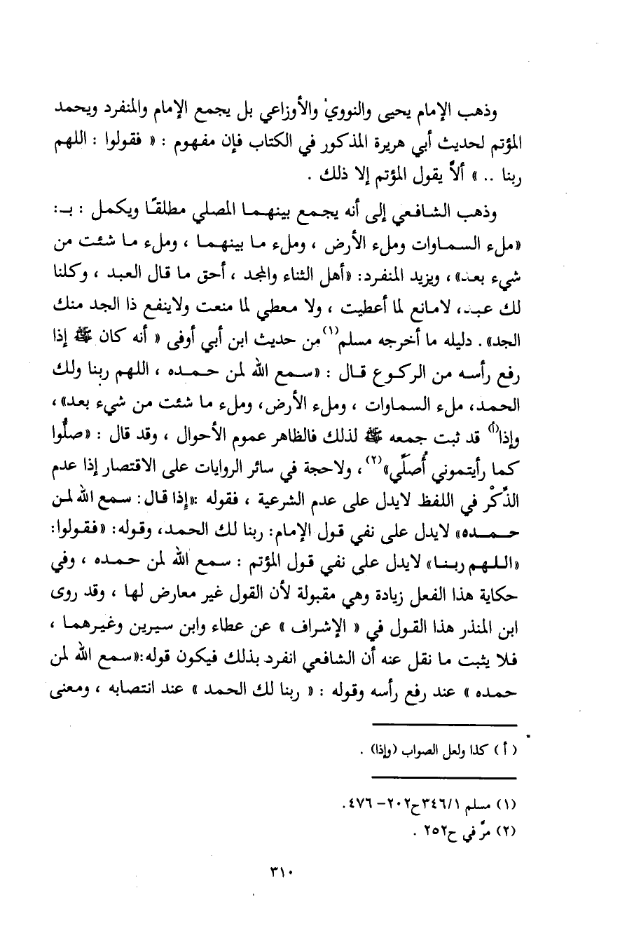 وذهب الشافعي إلى أنه يجمع بينهما المصلي مطلقًا ويكمل: بـ: "ملء السماوات وملء الأرض، وملء ما بينهما، وملء ما شئت من شيء بعد"، ويزيد المنفرد: "أهل الثناء والمجد، أحق ما قال العبد، وكلنا لك عبد، لا مانع لما أعطيت، ولا معطي لما منعت ولا ينفع ذا الجد منك الجد". دليله ما أخرجه مسلم (¬1) من حديث ابن أبي أوفى "أنه كان - صلى الله عليه وسلم - إذا رفع رأسه من الركوع قال: "سمع اللَّه لمن حمده، اللهم ربنا ولك الحمد، ملء السماوات، وملء الأرض، وملء ما شئت من شيء بعد"، وإذا (أ) قد ثبت جمعه - صلى الله عليه وسلم - لذلك فالظاهر عموم الأحوال، وقد قال: "صلُّوا كما رأيتموني أُصَلِّي" (¬2)، ولا حجة في سائر الروايات على الاقتصار إذا عدم الذِّكْر في اللفظ لا يدل على عدم الشرعية، فقوله: "إِذا قال: سمع اللَّه لمن حمده" لا يدل على نفي قول الإمام: ربنا لك الحمد، وقوله: "فقولوا: "اللهم ربنا" لا يدل على نفي قول المؤتم: سمع اللَّه لمن حمده، وفي حكاية هذا الفعل زيادة وهي مقبولة لأن القول غير معارض لها، وقد روى ابن المنذر هذا القول في "الإشراف" عن عطاء وابن سيرين وغيرهما، فلا يثبت ما نقل عنه أن الشافعي انفرد بذلك فيكون قوله: "سمع اللَّه لمن حمده" عند رفع رأسه وقوله: "ربنا لك الحمد" عند انتصابه، ومعنى