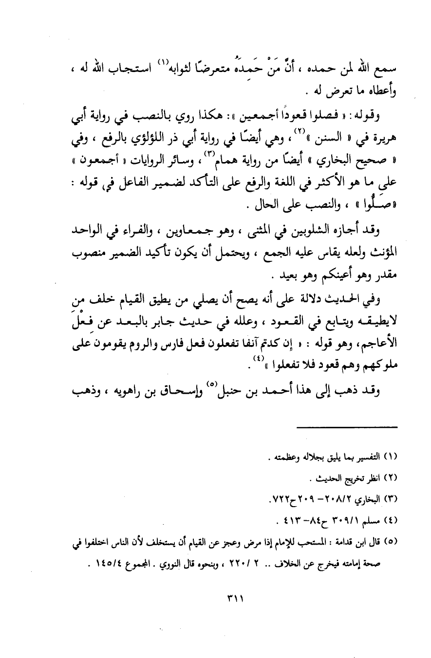 (¬5) قال ابن قدامة: المستحب للإمام إذا مرض وعجز عن القيام أن يستخلف لأن الناس اختلفوا في صحة إمامته فيخرج عن الخلاف .. 2/ 220، وبنحوه قال النووي. المجموع 4/ 145.