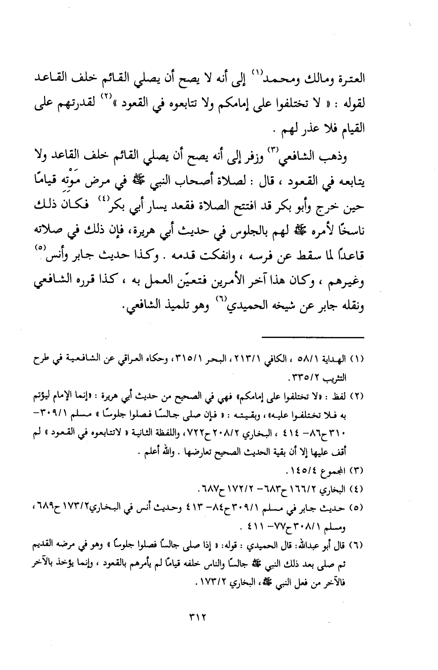 (¬6) قال أبو عبد اللَّه: قال الحميدي: قوله: "إذا صلى جالسًا فصلوا جلوسًا" وهو في مرضه القديم ثم صلى بعد ذلك النبي - صلى الله عليه وسلم - جالسًا والناس خلفه قيامًا لم يأمرهم بالقعود، وإنما يؤخذ بالآخر فالآخر من فعل النبي - صلى الله عليه وسلم -، البخاري 2/ 173.
