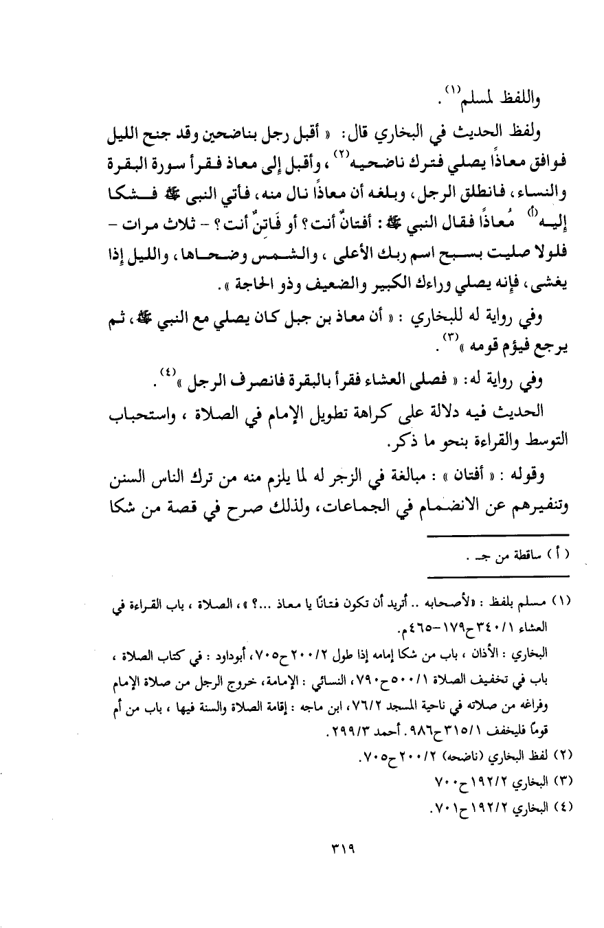 (¬1) مسلم بلفظ: "لأصحابه .. أتريد أن تكون فتانًا يا معاذ ... ؟ "، الصلاة، باب القراءة في العشاء 1/ 340 ح 179 - 465 م.