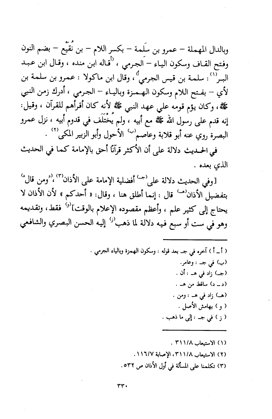 وبالدال المهملة- عمرو بن سَلمة -بكسر اللام- بن نُقَيْع -بضم النون وفتح القاف وسكون الياء- الجرمي، (أقاله ابن منده، وقال ابن عبد البر (¬1): سلمة بن قيس الجرمي، وقال ابن ماكولا: عمرو بن سلمة بن لأي -بفتح اللام وسكون الهمزة وبالياء- الجرمي، أدرك زمن النبي - صلى الله عليه وسلم -، وكان يؤم قومه على عهد النبي - صلى الله عليه وسلم - لأنه كان أقرأهم للقرآن، وقيل: إنه قدم على رسول اللَّه - صلى الله عليه وسلم - مع أبيه، ولم يُخْتَلَف في قدوم أبيه، نزل عمرو البصرة روي عنه أبو قلابة وعاصم (ب) الأحول وأبو الزبير المكي (¬2).
