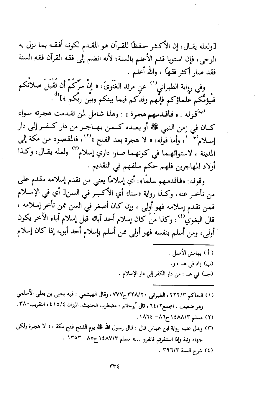 (ب) قوله: "فأقدمهم هجرة": وهذا شامل لمن تقدمت هجرته سواء كان في زمن النبي - صلى الله عليه وسلم - أو بعده كمن يهاجر من دار كفر إلى دار إسلام (جـ)، وأما قوله: "لا هجرة بعد الفتح" (¬2)، فالمقصود من مكة إلى المدينة، لاستوائهما في كونهما صارا داري إسلام (¬3) ولعله يقال: وكذا أولاد المهاجرين فلهم حكم سلفهم في التقديم.