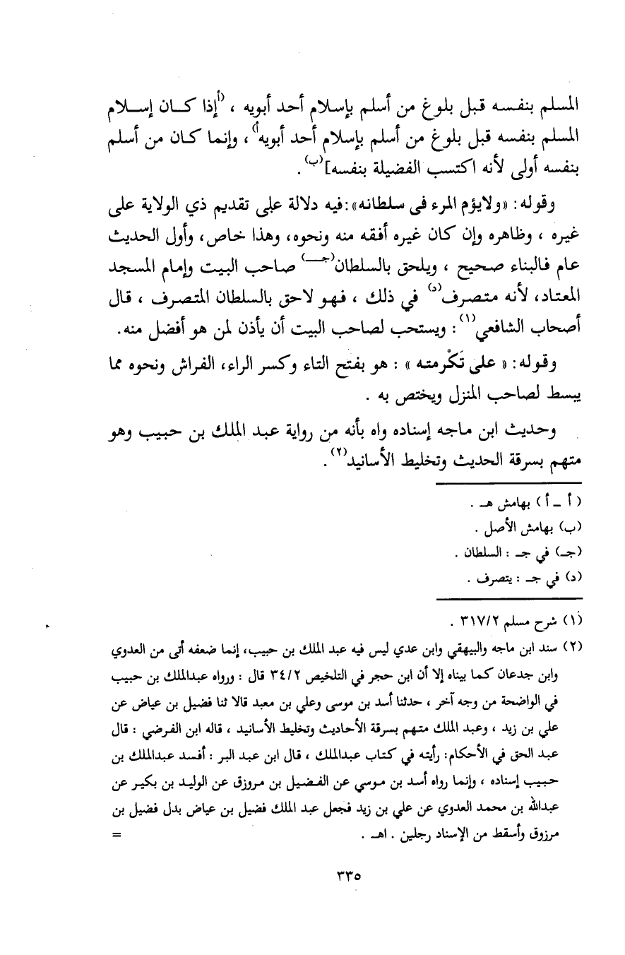 وقوله: "ولا يؤم المرء في سلطانه": فيه دلالة على تقديم ذي الولاية على غيره، وظاهره وإن كان غيره أفقه منه ونحوه، وهذا خاص، وأول الحديث عام فالبناء صحيح، ويلحق بالسلطان (ب) صاحب البيت وإمام المسجد المعتاد، لأنه متصرف (د) في ذلك، فهو لاحق بالسلطان المتصرف، قال أصحاب الشافعي (¬1): ويستحب لصاحب البيت أن يأذن لمن هو أفضل منه.