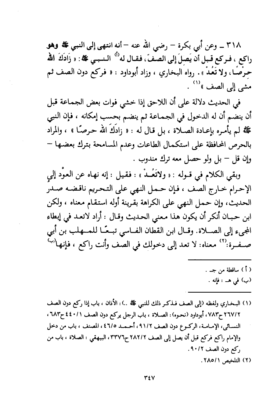 318 - وعن أبي بكرة -رضي اللَّه عنه- أنه انتهى إِلى النبي - صلى الله عليه وسلم - وهو راكع، فركع قبل أن يَصِلَ إِلى الصفّ، فقال له (أ) النبي - صلى الله عليه وسلم -: "زَادَكَ الله حِرْصًا، ولا تَعُدْ". رواه البخاري، وزاد أبو داود: "فركع دون الصف ثم مشى إلى الصف" (¬1).