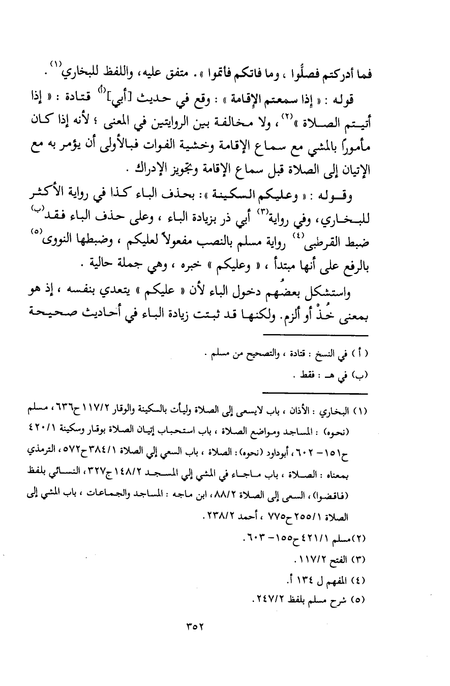 (¬1) البخاري: الأذان، باب لا يسعى إلى الصلاة وليأت بالسكينة والوتار 2/ 117 ح 636، مسلم (نحوه): المساجد ومواضع الصلاة، باب استحباب إتيان الصلاة بوقار وسكينة 1/ 420 ح 151 - 602، أبو داود (نحوه): الصلاة، باب السعى إلى الصلاة 1/ 384 ح 572، الترمذي بمعناه: الصلاة، باب ما جاء في المشي إلى المسجد 2/ 148 جـ 327، النسائي بلفظ (فاقضوا)، السعي إلى الصلاة 2/ 88، ابن ماجه: المساجد والجماعات، باب المشي إلى الصلاة 1/ 255 ح 775، أحمد 2/ 238.