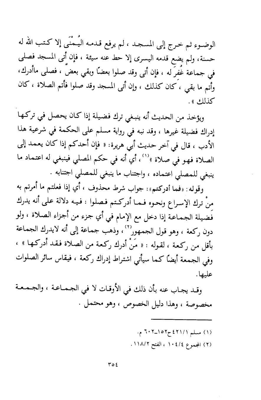 ويؤخذ من الحديث أنه ينبغي ترك فضيلة إذا كان يحصل في تركها إدراك فضيلة غيرها، وقد نبه في رواية مسلم على الحكمة في شرعية هذا الأدب، قال في آخر حديث أبي هريرة: "فإن أحدكم إذا كان يعمد إلى الصلاة فهو في صلاة" (¬1)، أي أنه في حكم المصلي فينبغي له اعتماد ما ينبغي للمصلي اعتماده، واجتناب ما ينبغي للمصلي اجتنابه.