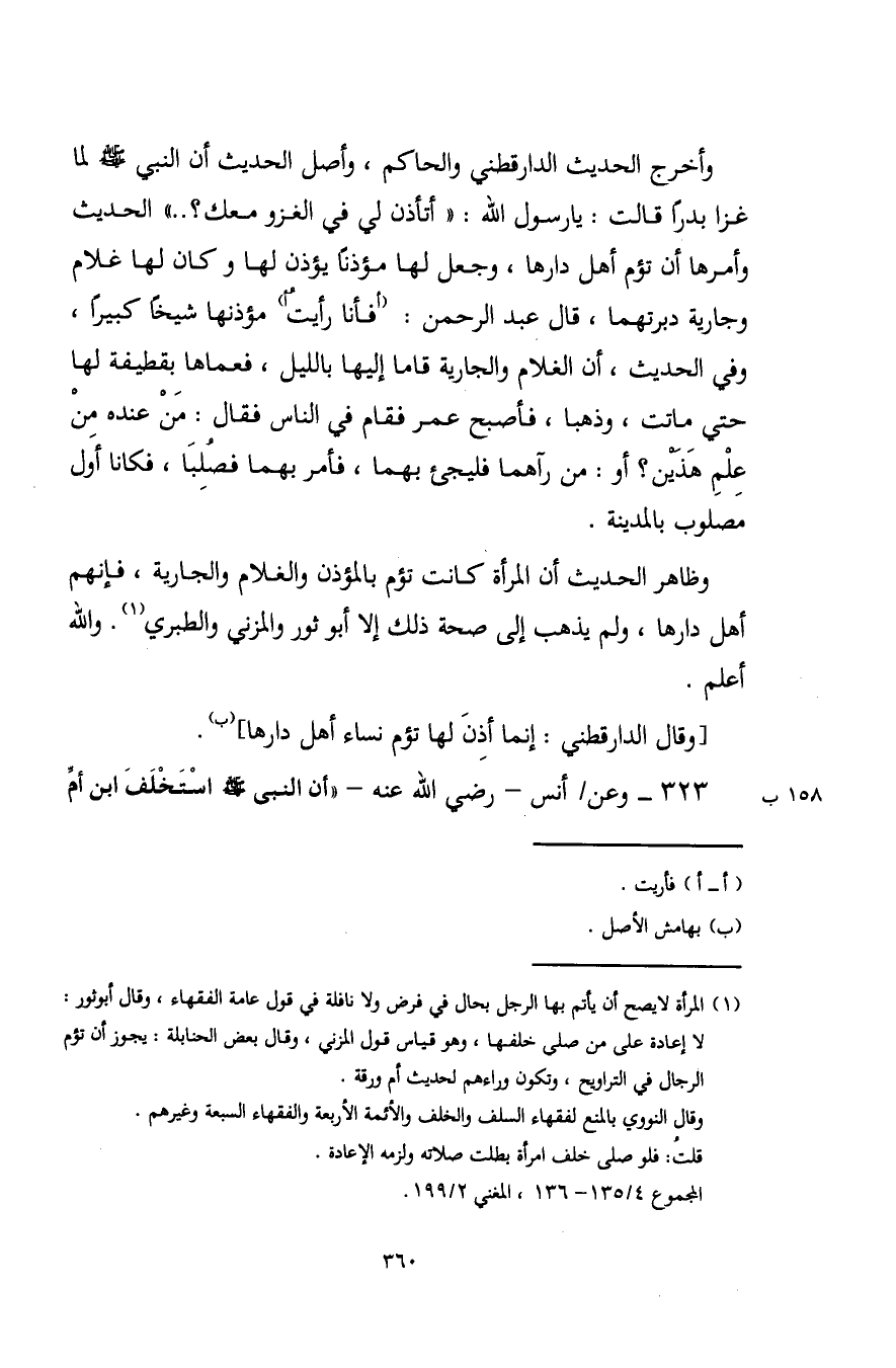 وأخرج الحديث الدارقطني والحاكم، وأصل الحديث أن النبي - صلى اللَّه عليه وسلم - لما غزا بدرًا قالت: يا رسول اللَّه: "أتأذن لي في الغزو معك؟ .. " الحديث وأمرها أن تؤم أهل دارها، وجعل لها مؤذنًا يؤذن لها وكان لها غلام وجارية دبرتهما، قال عبد الرحمن: (أفأنا رأيتُ أ) مؤذنها شيخًا كبيرًا، وفي الحديث، أن الغلام والجارية قاما إليها بالليل، فعماها بقطيفة لها حتى ماتت، وذهبا، فأصبح عمر فقام في الناس فقال: مَنْ عنده منْ عِلْمِ هَذين؟ أو: من رآهما فليجئ بهما، فأمر بهما فصُلِبَا، فكانا أوَل مصلوب بالمدينة.