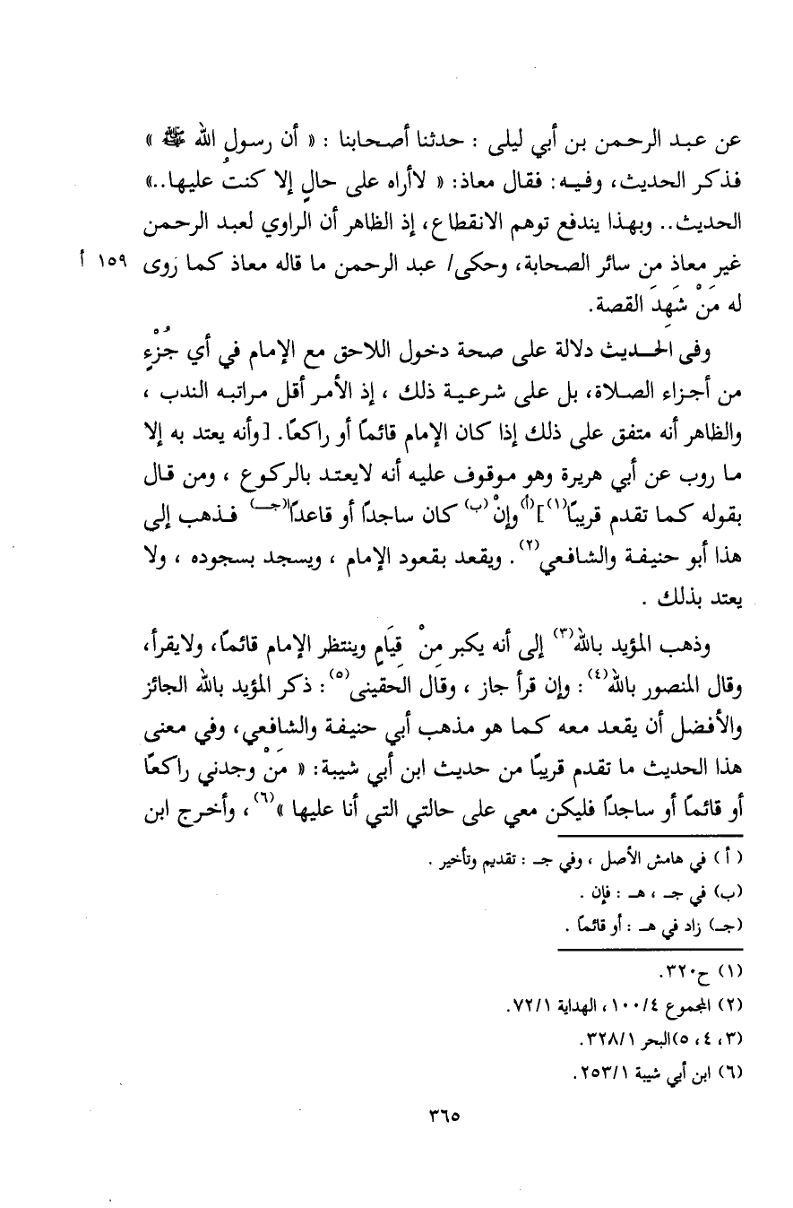 وذهب المؤيد بالله (¬3) إلى أنه يكبر مِنْ قيَامٍ وينتظر الإمام قائمًا، ولا يقرأ، وقال المنصور بالله (¬4): وإن قرأ جاز، وقال الحقيني (¬5): ذكر المؤيد بالله الجائز والأفضل أن يقعد معه كما هو مذهب أبي حنيفة والشافعي، وفي معنى هذا الحديث ما تقدم قريبًا من حديث ابن أبي شيبة: "مَنْ وجدني راكعًا أو قائمًا أو ساجدًا فليكن معي على حالتي التي أنا عليها" (¬6)، وأخرج ابن