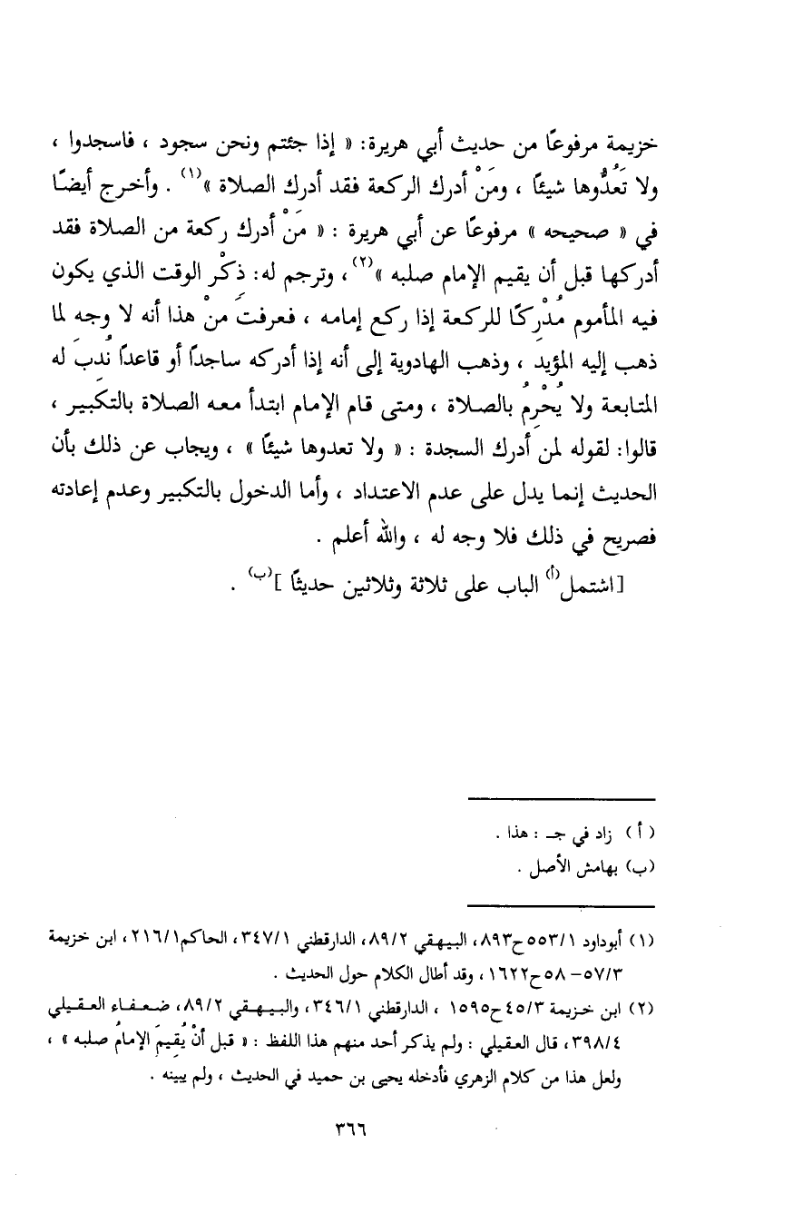 (¬2) ابن خزيمة 3/ 45 ح 1595، الدارقطني 1/ 346، والبيهقي 2/ 89، ضعفاء العقيلي 4/ 398، قال العقيلي: ولم يذكر أحد منهم هذا اللفظ: "قبل أنْ يُقِيمَ الإمامُ صلبه"، ولعل هذا من كلام الزهري فأدخله يحيى بن حميد في الحديث، ولم يبينه.