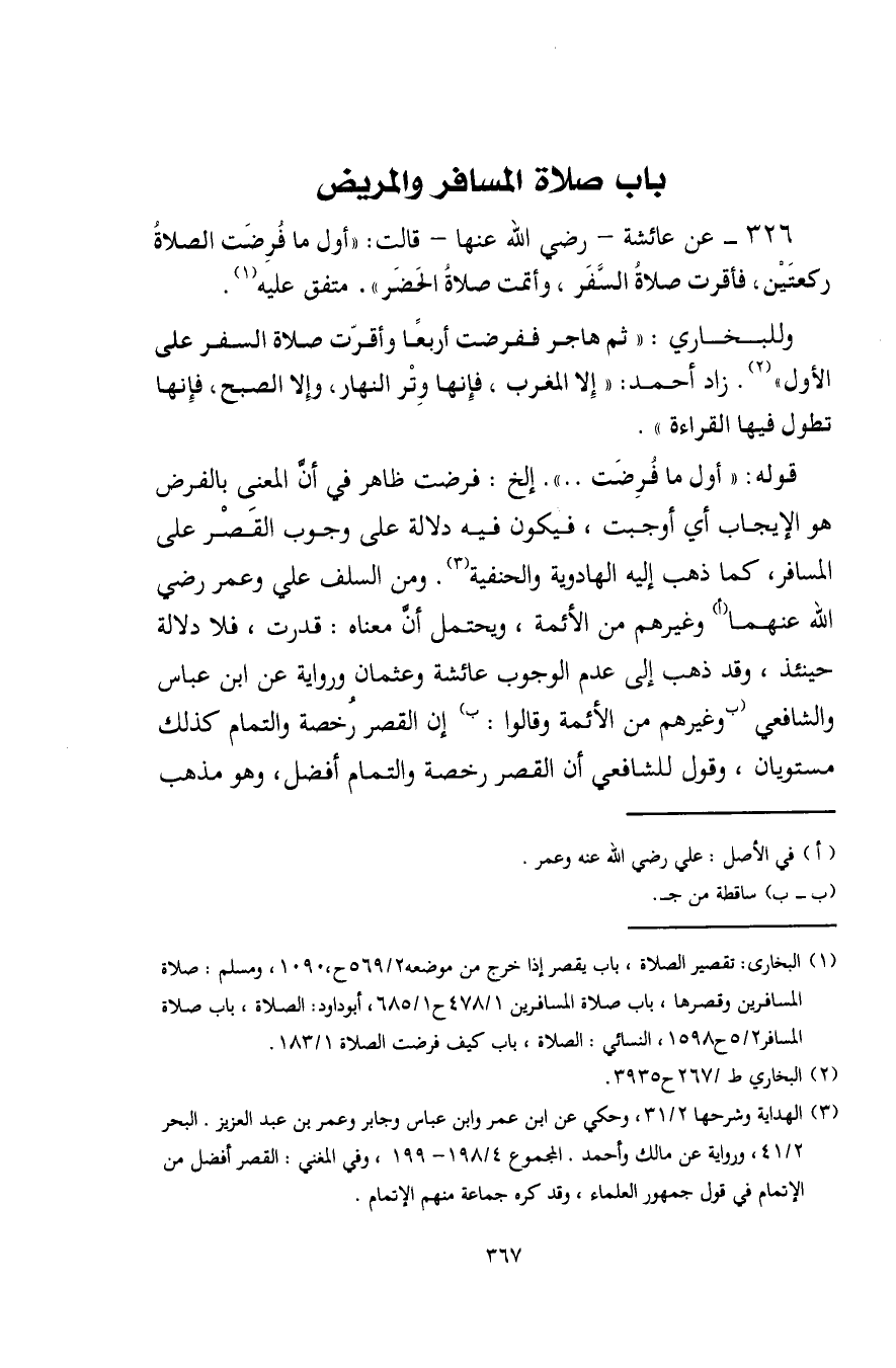 326 - عن عائشة - رضي الله عنها - قالت: "أول ما فُرِضَت الصلاةُ ركعتَيْن، فأقرت صلاةُ السَّفَر، وأتمت صلاةُ الحَضَر". متفق عليه (¬1).