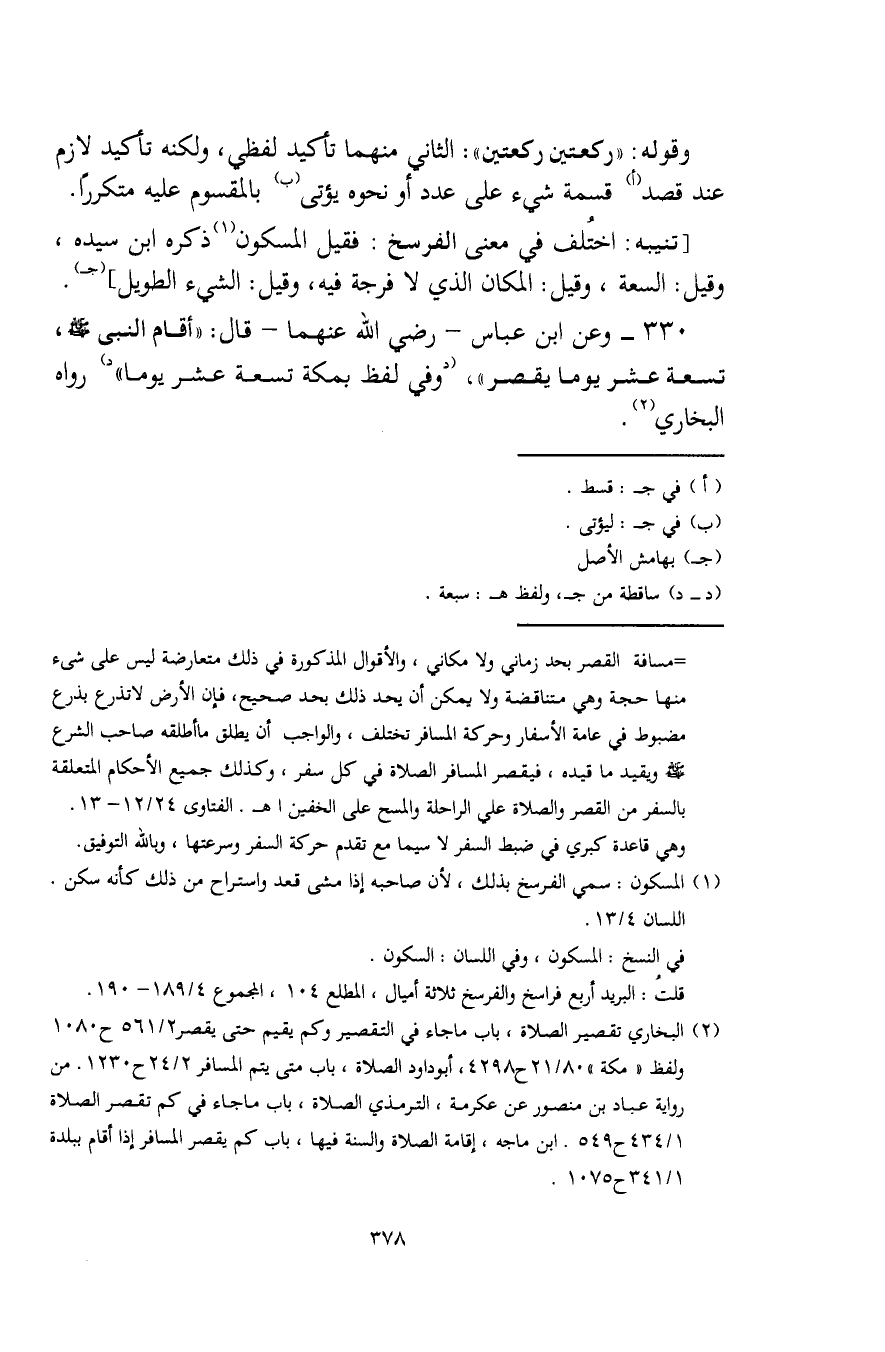 (¬2) البخاري تقصير الصلاة، باب ما جاء في المصير وكم يقيم حتى يقصر 2/ 561 ح 1080 ولفظ "مكة" 80/ 21 ح 4298، أبو داود الصلاة، باب متى يتم المسافر 2/ 24 ح 1230. من رواية عباد بن منصور عن عكرمة، الترمذي الصلاة، باب ما جاء في كم تقصر الصلاة 1/ 434 ح 549. ابن ماجه، إقامة الصلاة والسنة فيها، باب كم يقصر المسافر إذا أقام ببلدة 1/ 341 ح 1075.