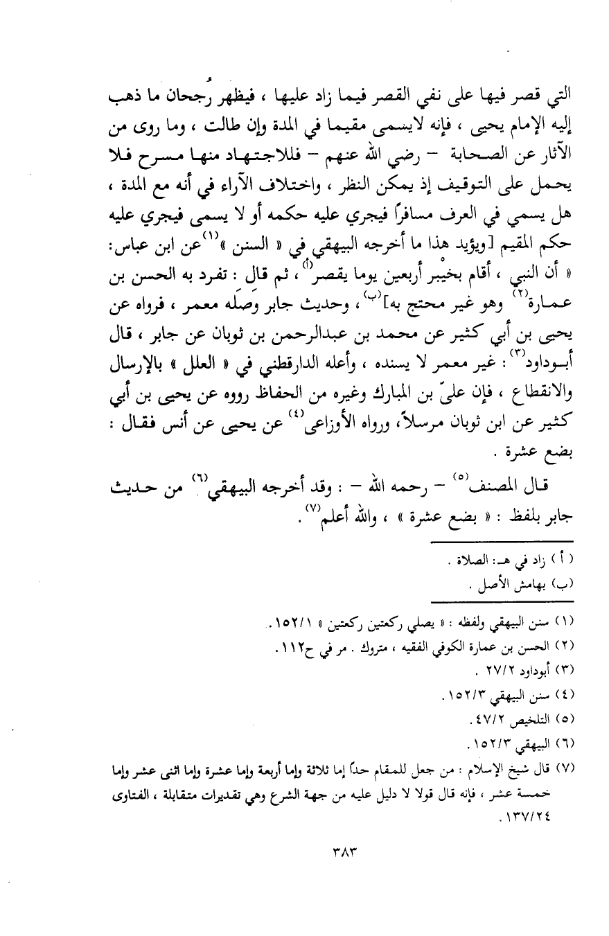 (¬7) قال شيخ الإسلام: من جعل للمقام حدًّا إما ثلاثة وإما أربعة وإما عشرة وإما اثنى عشر وإما خمسة عشر، فإنه قال قولا لا دليل عليه من جهة الشرع وهي تقديرات متقابلة، الفتاوى 24/ 137.