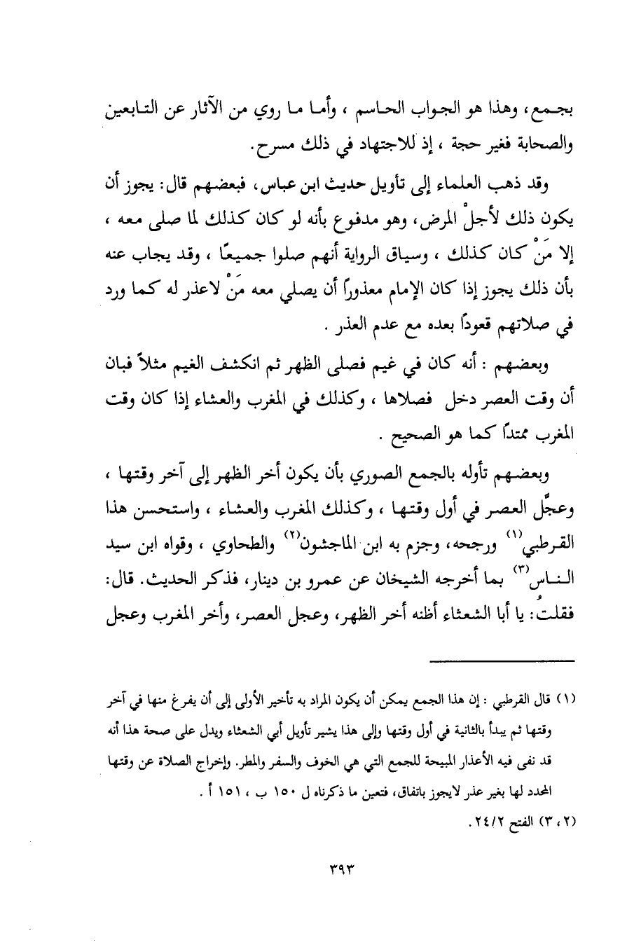 (¬1) قال القرطبي: إن هذا الجمع يمكن أن يكون المراد به تأخير الأولى إلى أن يفرغ منها في آخر وقتها ثم يبدأ بالثانية في أول وقتها وإلى هذا يشير تأويل أبي الشعثاء ويدل على صحة هذا أنه قد نفى فيه الأعذار المبيحة للجمع التي هي الخوف والسفر والمطر. وإخراج الصلاة عن وقتها المحدد لها بغير عذر لا يجوز باتفاق، فتعين ما ذكرناه ل 150 ب، 151 أ.