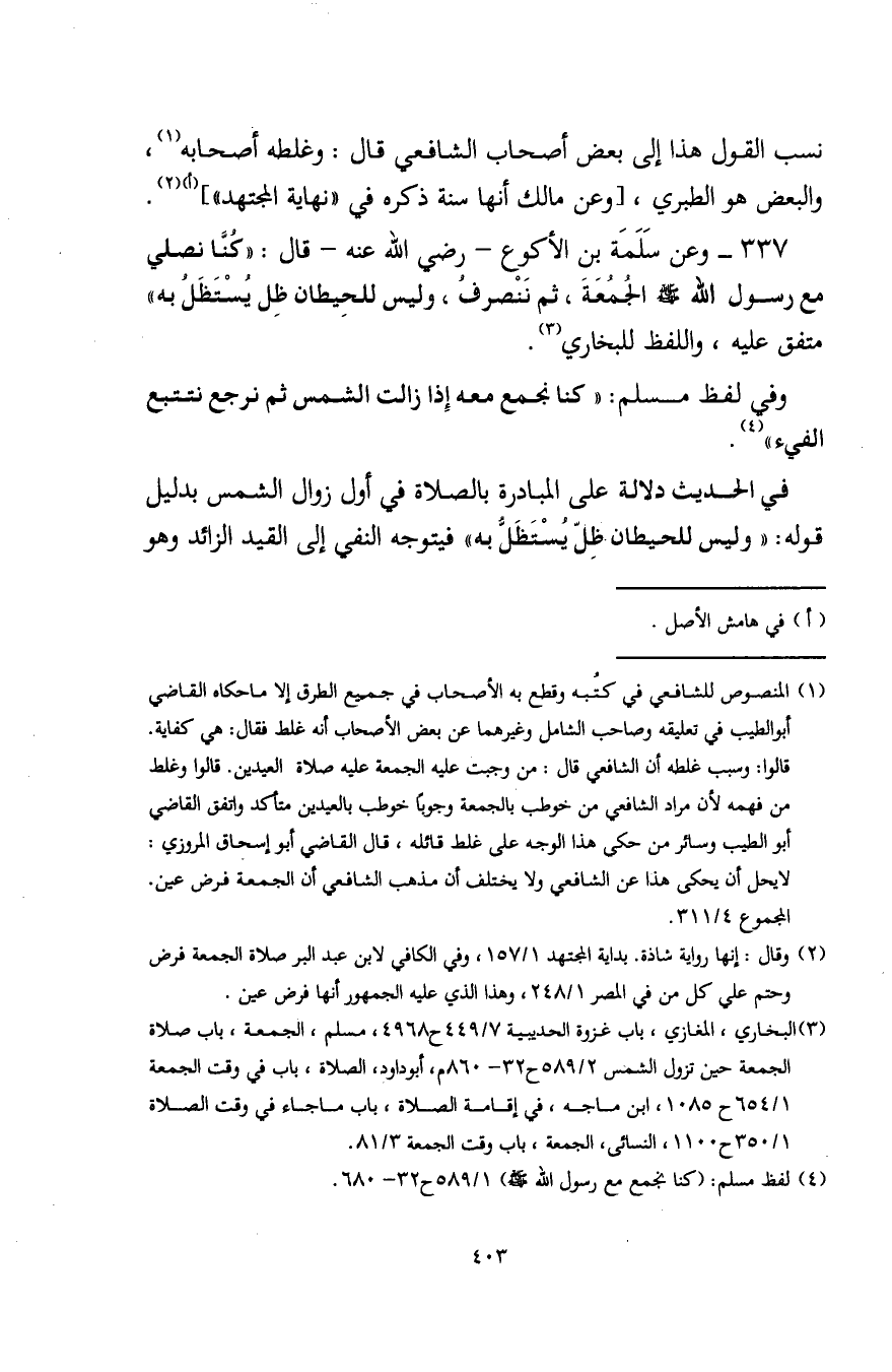 (¬3) البخاري، المغازي، باب غزوة الحديبية 7/ 449 ح 4968، مسلم، الجمعة، باب صلاة الجمعة حين تزول الشمس 2/ 589 ح 32 - 860 م، أبو داود، الصلاة، باب في وقت الجمعة 1/ 654 ح 1085، ابن ماجه، في إقامة الصلاة، باب ما جاء في وقت الصلاة 1/ 350 ح 1100، النسائي، الجمعة، باب وقت الجمعة 3/ 81.