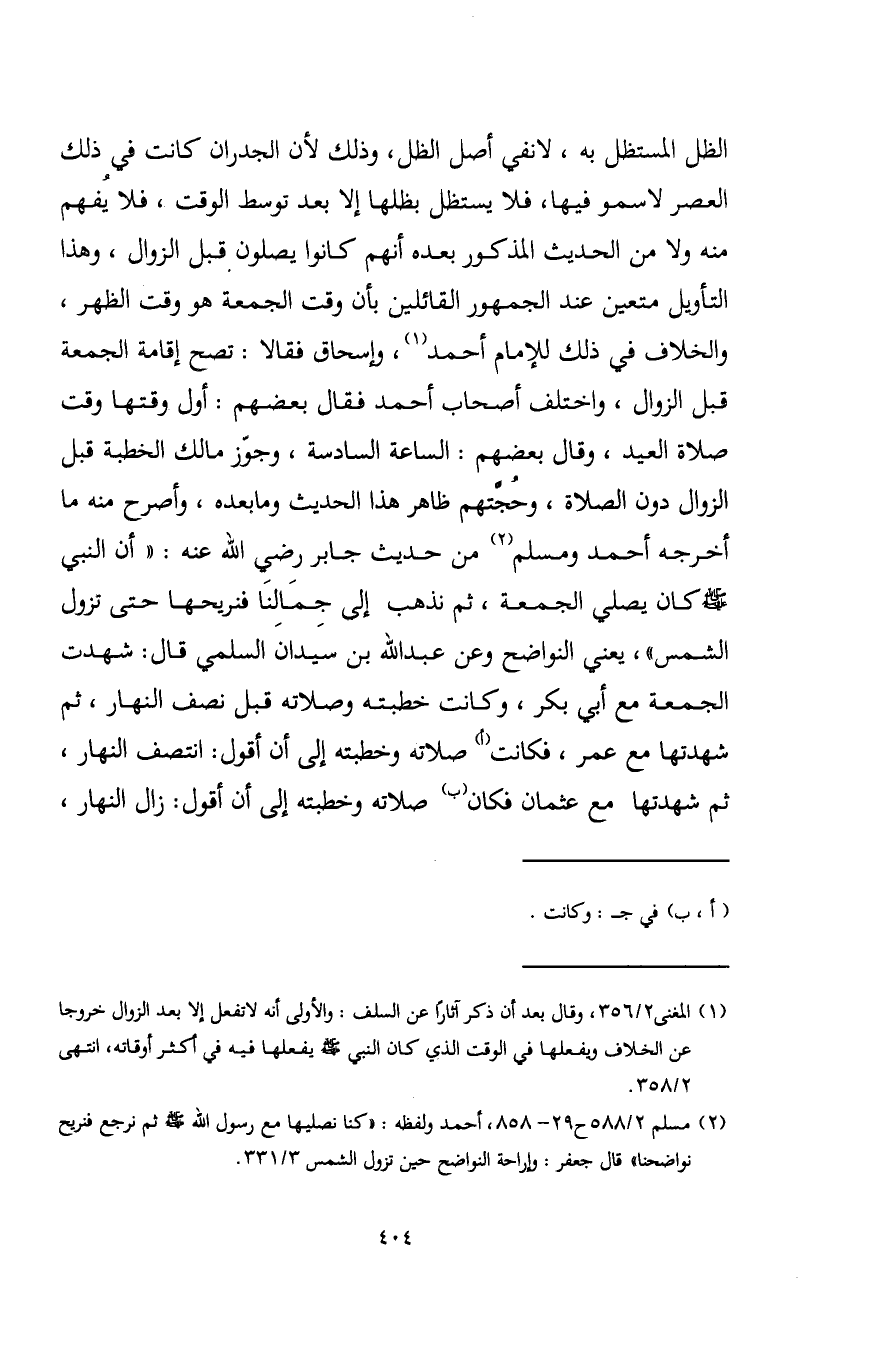 الظل المستظل به، لا نفي أصل الظل، وذلك لأن الجدران كانت في ذلك العصر لا سمو فيها، فلا يستظل بظلها إلا بعد توسط الوقت، فلا يُفهم منه ولا من الحديث المذكور بعده أنهم كانوا يصلون قبل الزوال، وهذا التأويل متعين عند الجمهور القائلين بأن وقت الجمعة هو وقت الظهر، والخلاف في ذلك للإمام أحمد (¬1)، وإسحاق فقالا: تصح إقامة الجمعة قبل الزوال، واختلف أصحاب أحمد فقال بعضهم: أول وقتها وقت صلاة العيد، وقال بعضهم: الساعة السادسة، وجوّز مالك الخطبة قبل الزوال دون الصلاة، وحُجَّتهم ظاهر هذا الحديث وما بعده، وأصرح منه ما أخرجه أحمد ومسلم (¬2) من حديث جابر رضي الله عنه: "أن النبي - صلى الله عليه وسلم - كان يصلي الجمعة، ثم نذهب إلى جِمَالِنَا فنريحها حتى تزول الشمس"، يعني النواضح وعن عبد الله بن سَيدانَ السلمي قال: شهدت الجمعة مع أبي بكر، وكانت خطبته وصلاته قبل نصف النهار، ثم شهدتها مع عمر، فكانت (أ) صلاته وخطبته إلى أن أقول: انتصف النهار، ثم شهدتها مع عثمان فكان (ب) صلاته وخطبته إلى أن أقول: زال النهار،