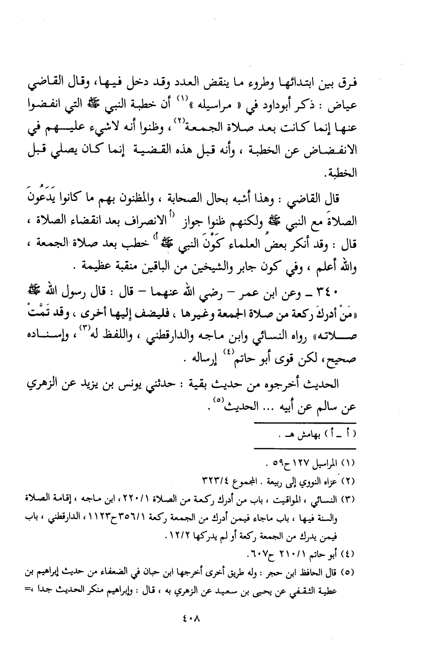 (¬3) النسائي، المواقيت، باب من أدرك ركعة من الصلاة 1/ 220، ابن ماجه، إقامة الصلاة والسنة فيها، باب ما جاء فيمن أدرك من الجمعة ركعة 1/ 356 ح 1123، الدارقطني، باب فيمن يدرك من الجمعة ركعة أو لم يدركها 2/ 12.