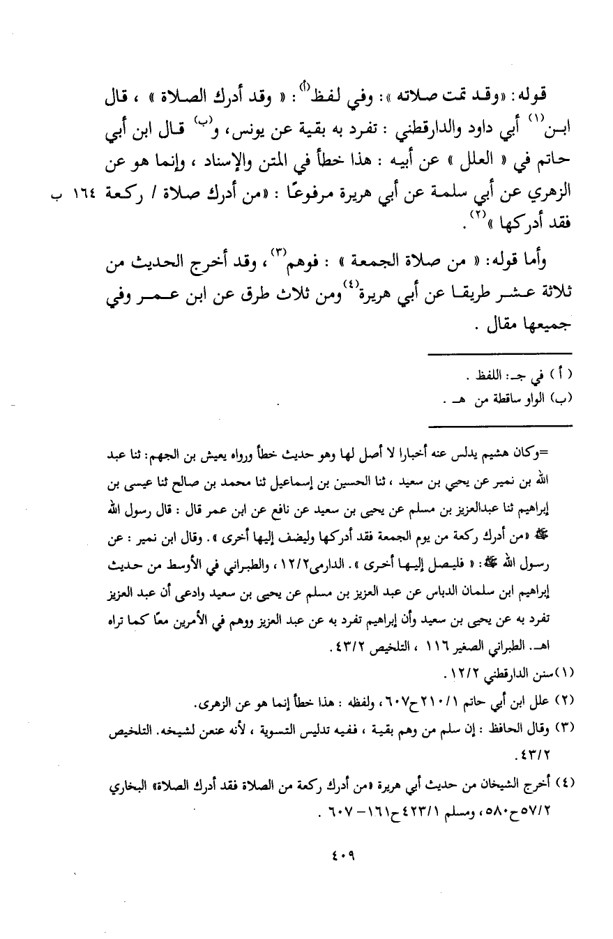 = وكان هشيم يدلس عنه أخبارا لا أصل لها وهو حديث خطأ ورواه يعيش بن الجهم: ثنا عبد الله بن نمير عن يحيى بن سعيد، ثنا الحسين بن إسماعيل ثنا محمد بن صالح ثنا عيسى بن إبراهيم ثنا عبد العزيز بن مسلم عن يحيى بن سعيد عن نافع عن ابن عمر قال: قال رسول الله - صلى الله عليه وسلم - "من أدرك ركعة من يوم الجمعة فقد أدركها وليضف إليها أخرى" وقال ابن نمير: عن رسول الله - صلى الله عليه وسلم -: "فليصل إليها أخرى". الدارمى 2/ 12، والطبراني في الأوسط من حديث إبراهيم بن سلمان الدباس عن عبد العزيز بن مسلم عن يحيى بن سعيد وادعى أن عبد العزيز تفرد به عن يحيى بن سعيد وأن إبراهيم تفرد به عن عبد العزيز ووهم في الأمرين معًا كما تراه اهـ. الطبراني الصغير 116، التلخيص 2/ 43.