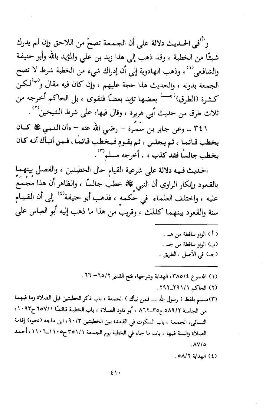 و (أ) في الحديث دلالة على ان الجمعة تصحّ من اللاحق وإن لم يدرك شيئًا من الخطبة، وقد ذهب إلى هذا زيد بن علي والمؤيد بالله وأبو حنيفة والشافعي (¬1)، وذهب الهادوية إلى أن إدراك شيء من الخطبة شرط لا تصح الجمعة بدونه، والحديث هذا حجة عليهم، وإن كان فيه مقال و (ب) لكن كثرة (الطرق) (جـ) بعضها تؤيد بعضًا فتقوى، بل الحاكم أخرجه من ثلاث طرق من حديث أبي هريرة، وقال فيها: على شرط الشيخين (¬2).