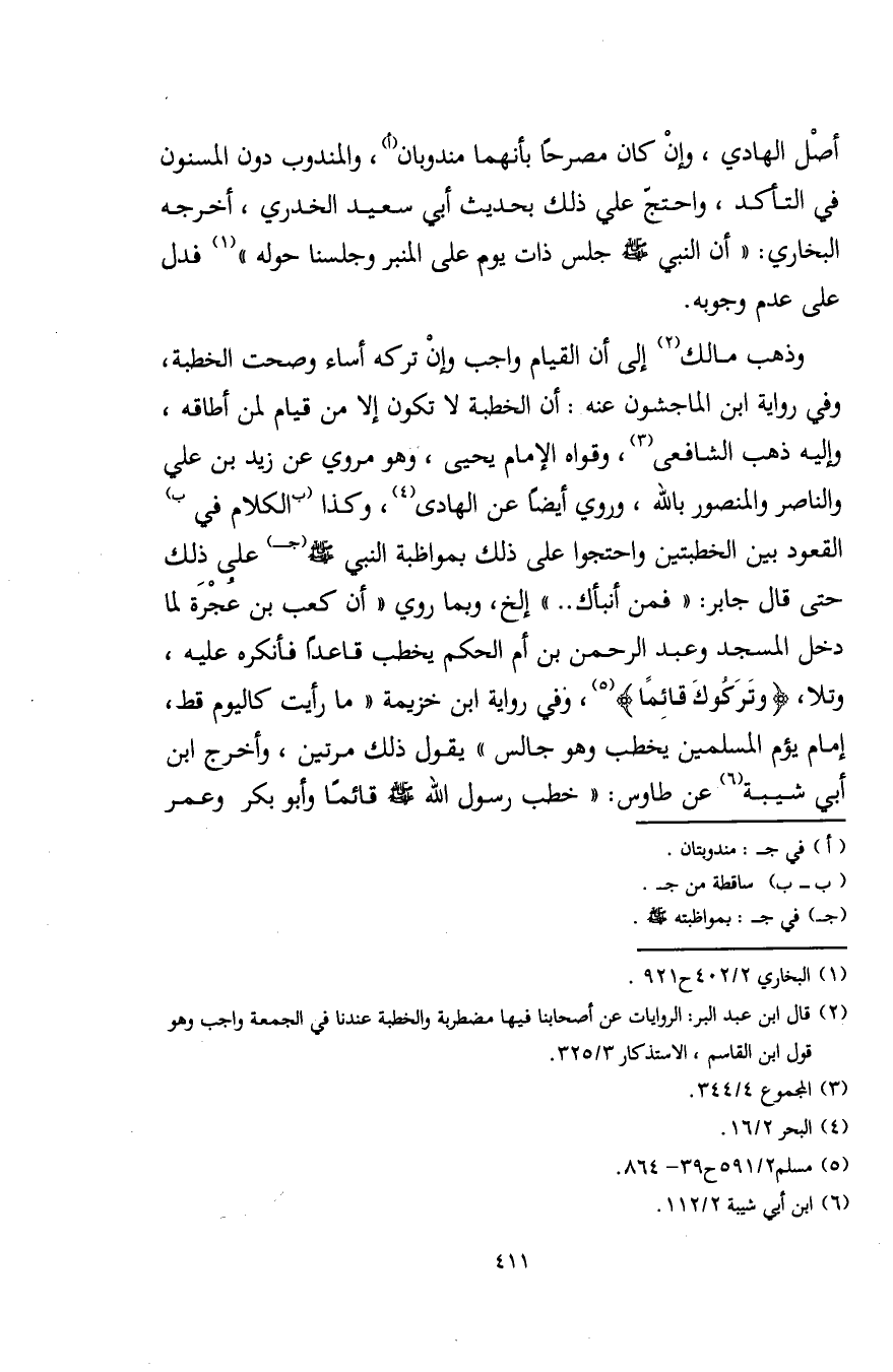 (¬2) قال ابن عبد البر: الروايات عن أصحابنا فيها مضطربة والخطبة عندنا في الجمعة واجب وهو قول ابن القاسم، الاستذكار 3/ 325.