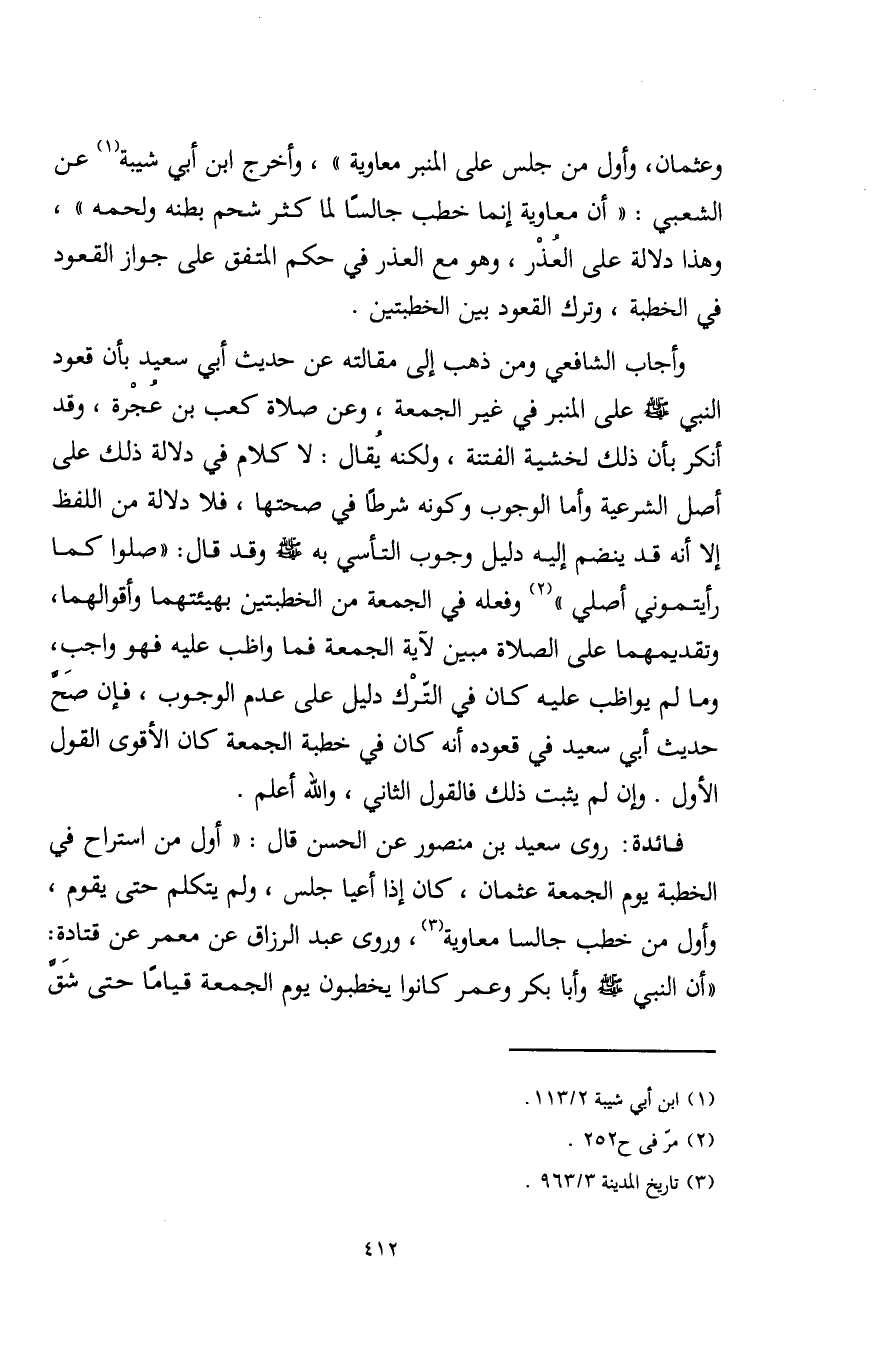 فائدة: روى سعيد بن منصور عن الحسن قال: "أول من استراح في الخطبة يوم الجمعة عثمان، كان إذا أعيا جلس، ولم يتكلم حتى يقوم، وأول من خطب جالسا معاوية (¬3)، وروى عبد الرزاق عن معمر عن قتادة: "أن النبي - صلى الله عليه وسلم - وأبا بكر وعمر كانوا يخطبون يوم الجمعة قيامًا حتى شَقَّ