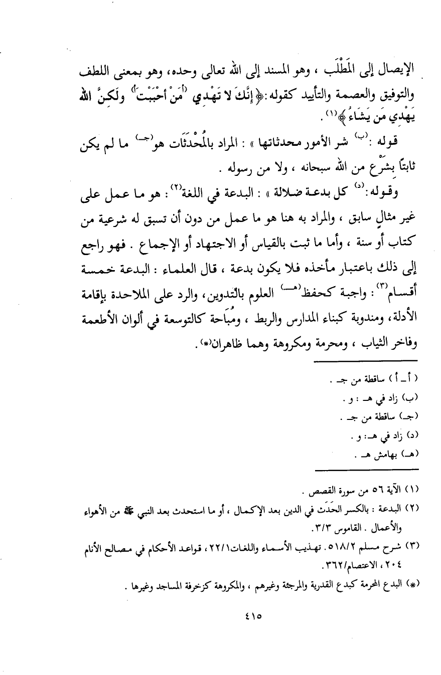 وقوله: (د) كل بدعة ضلالة": البدعة في اللغة (¬2): هو ما عمل على غير مثالٍ سابق، والمراد به هنا هو ما عمل من دون أن تسبق له شرعية من كتاب أو سنة، وأما ما ثبت بالقياس أو الاجتهاد أو الإجماع. فهو راجع إلى ذلك باعتبار مأخذه فلا يكون بدعة، قال العلماء: البدعة خمسة أقسام (¬3): واجبة كحفظ (هـ) العلوم بالتدوين، والرد على الملاحدة بإقامة الأدلة، ومندوبة كبناء المدارس والربط، ومُبَاحة كالتوسعة في ألوان الأطعمة وفاخر الثياب، ومحرمة ومكروهة وهما ظاهران (*).
