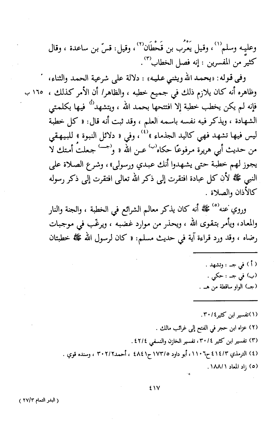 وفي قوله: "يحمد الله ويثني عليه": دلالة على شرعية الحمد والثناء، وظاهره أنه كان يلازم ذلك في جميع خطبه، والظاهر أن الأمر كذلك، فإنه لم يكن يخطب خطبة إلا افتتحها بحمد الله، ويتشهد (أ) فيها بكلمتي الشهادة، ويذكر فيه نفسه باسمه العلم، وقد ثبت أنه قال: "كل خطبة ليس فيها تشهد فهي كاليد الجذماء" (¬4)، وفي "دلائل النبوة" للبيهقي من حديث أبي هريرة مرفوعًا حكاه (ب) عن الله" و (جـ) جعلتُ أمتك لا يجوز لهم خطبة حتى يشهدوا أنك عبدي ورسولي" وشرع الصلاة على النبي - صلى الله عليه وسلم - لأن كل عبادة افتقرت إلى ذكر الله تعالى افتقرت إلى ذكر رسوله كالأذان والصلاة.