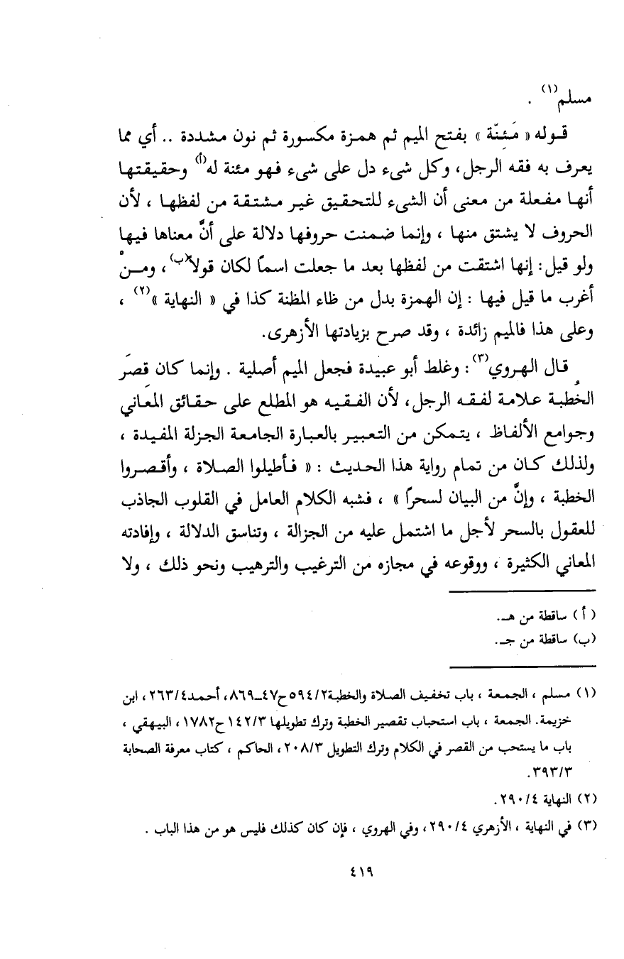 قال الهروي (¬3): وغلط أبو عبيدة فجعل الميم أصلية. وإنما كان قِصَر الخطبة علامة لفقه الرجل، لأن الفقيه هو المطلع على حقائق المعاني وجوامع الألفاظ، يتمكن من التعبير بالعبارة الجامعة الجزلة المفيدة، ولذلك كان من تمام رواية هذا الحديث: "فأطيلوا الصلاة، وأقصروا الخطبة، وإنَّ من البيان لسحرًا"، فشبه الكلام العامل في القلوب الجاذب للعقول بالسحر لأجل ما اشتمل عليه من الجزالة، وتناسق الدلالة، وإفادته المعاني الكثيرة، ووقوعه في مجازه من الترغيب والترهيب ونحو ذلك، ولا