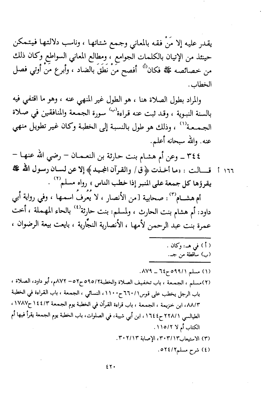 (¬2) مسلم، الجمعة، باب تخفيف الصلاة والخطبة 2/ 595 ح 52 - 872 م، أبو داود، الصلاة، باب الرجل يخطب على قوس 1/ 660 ح 1100، النسائي، الجمعة، باب القراءة في الخطبة 3/ 88، ابن خزيمة، الجمعة، باب قراءة القرآن في الخطبة يوم الجمعة 4/ 143 ح 1787، الطيالسي 1/ 228 ح 1644، ابن أبي شيبة، في الصلوات، باب الخطبة يوم الجمعة يقرأ فيها أم الكتاب أم لا 2/ 115.