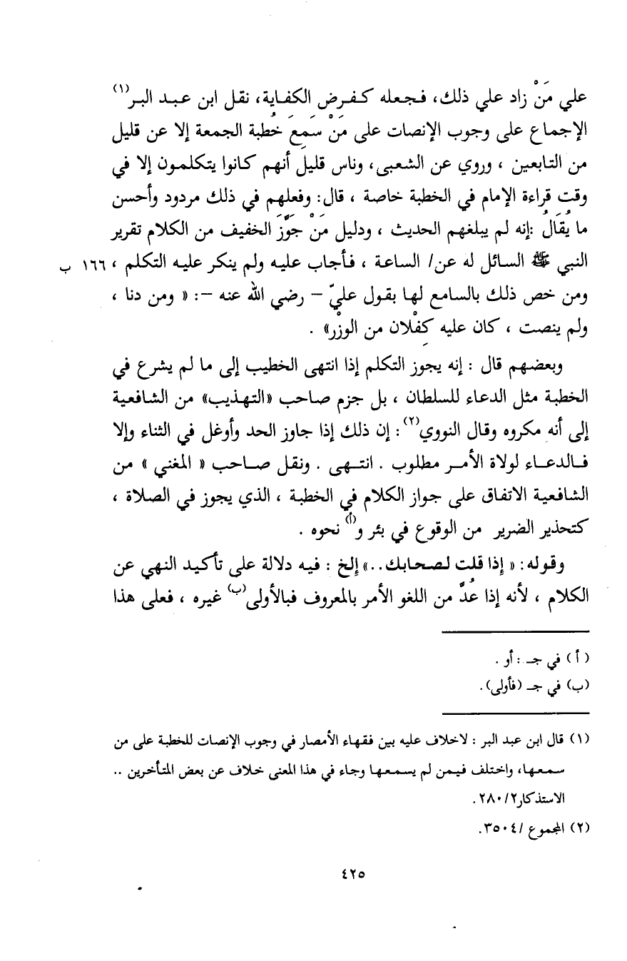 (¬1) قال ابن عبد البر: لا خلاف عليه بين فقهاء الأمصار في وجوب الإنصات للخطبة على من سمعها، واختلف فيمن لم يسمعها وجاء في هذا المعنى خلاف عن بعض المتأخرين .. الاستذكار 2/ 280.