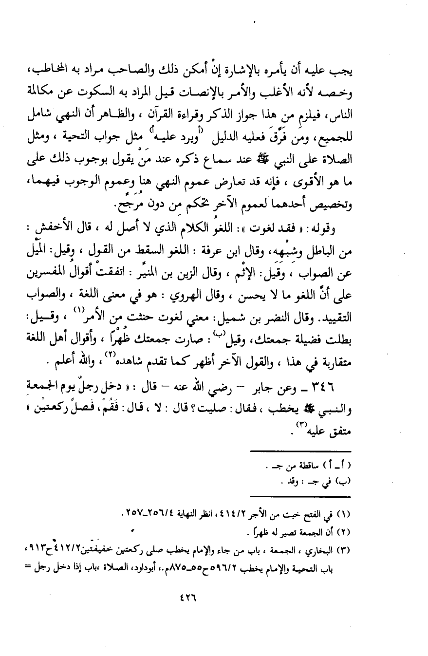 يجب عليه أن يأمره بالإشارة إنْ أمكن ذلك والصاحب مراد به المخاطب، وخصه لأنه الأغلب والأمر بالإنصات قيل المراد به السكوت عن مكالمة الناس، فيلزم من هذا جواز الذكر وقراءة القرآن، والظاهر أن النهي شامل للجميع، ومن فرق فعليه الدليل (أويرد عليه أ) مثل جواب التحية، ومثل الصلاة على النبي - صلى الله عليه وسلم - عند سماع ذكره عند مَن يقول بوجوب ذلك على ما هو الأقوى، فإنه قد تعارض عموم النهي هنا وعموم الوجوب فيهما، وتخصيص أحدهما لعموم الآخر تحكم مِن دون مُرجح.