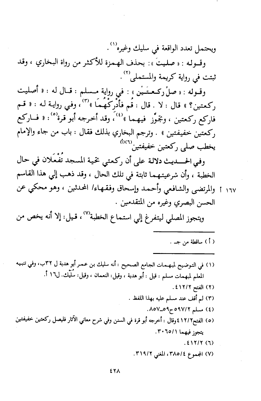 (¬5) الفتح 2/ 412 وقال: أخرجه أبو قرة في السنن وفي شرح معاني الآثار فليصل ركعتين خفيفتين يتجوز فيهما 1/ 3065.