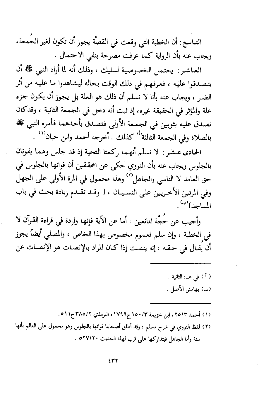 التاسع: أن الخطبة التي وقعت في القصة يجوز أن تكون لغير الجمعة، ويجاب عنه بأن الرواية كما عرفت مصرحة بنفي الاحتمال.
