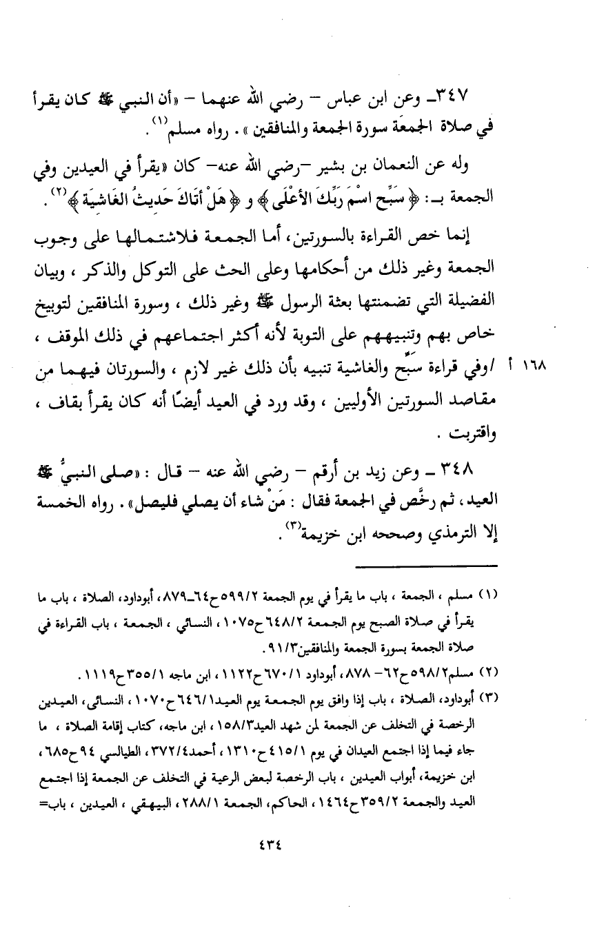 347 - وعن ابن عباس - رضي الله عنهما - "أن النبي - صلى الله عليه وسلم - كان يقرأ في صلاة الجمعة سورة الجمعة والمنافقين". رواه مسلم (¬1).